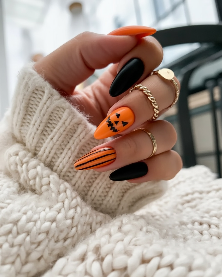 This outfit gives an impression of bundling up in a knit sweater and holding a pumpkin spice latte. These nails are cute and fun simultaneously as they have alternating orange and black and stripe details as well as a smiling jack-o-lantern.