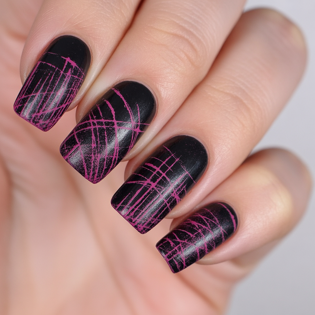 This gloomy mishmash of black and short purple feels nothing like witching hour. It has a matte look, which gives it a current feel, and the sharp black spiderwebs on purple is like a spellwork in the moon light. Bold yet stylish, it is just the right kind of one that an individual who favors a mystery to a certain degree ought to wear.