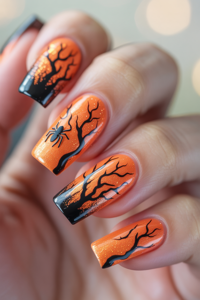 Shimmering signal orange horizons turn into impressions of haunting trees and spiders- this mani is a full story on your finger. It is beautifully haunting in the way that it is like a magical forest just prior to the witching hour.