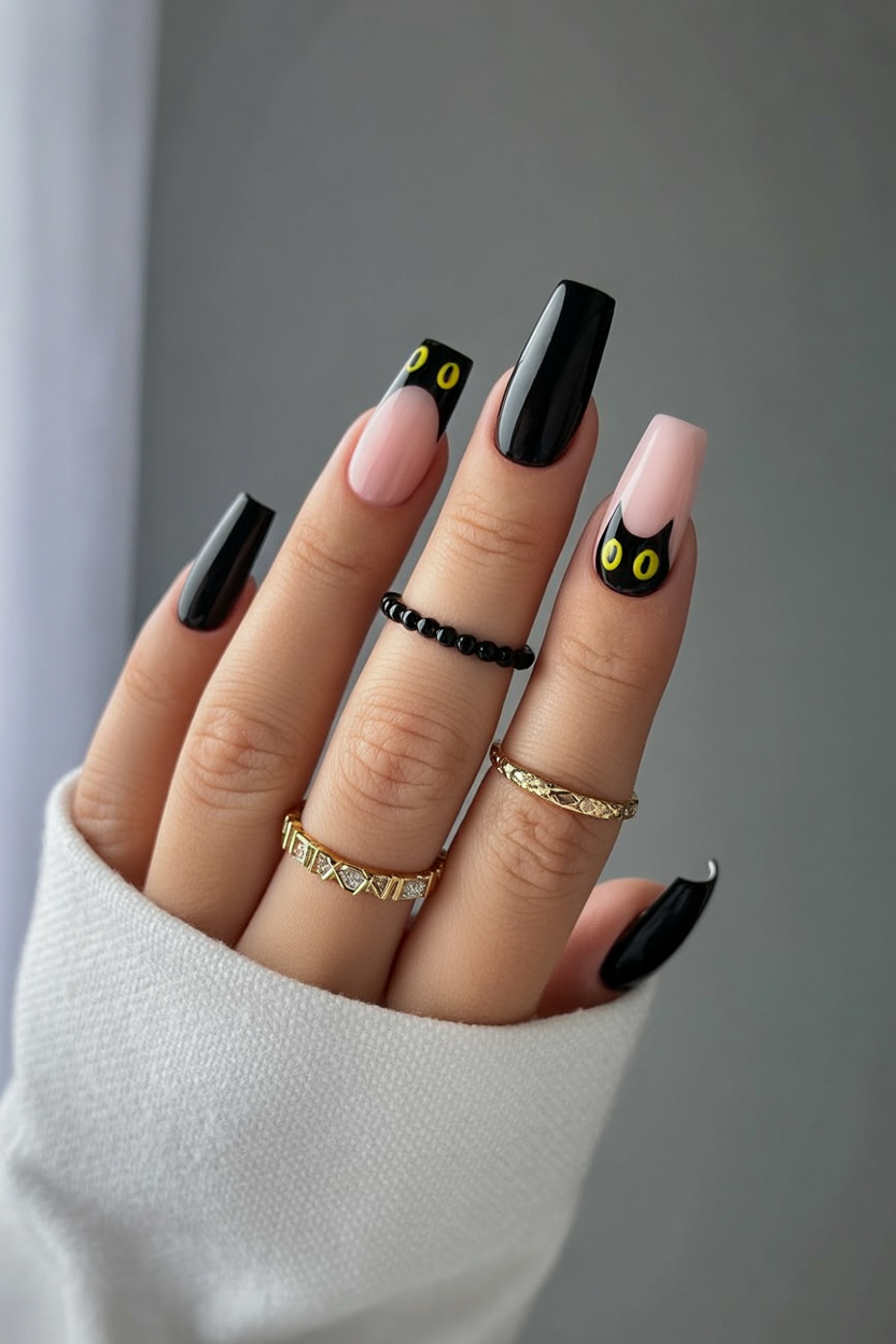 Cutesy but ominously stylish, this manicure is Halloween with a kitty style. Black cats with yellow eyes are peeking out on top of tender pink stocks, providing the traditional French tips with a creepy little makeover. The black and blush nails are dramatic but not to extremes.