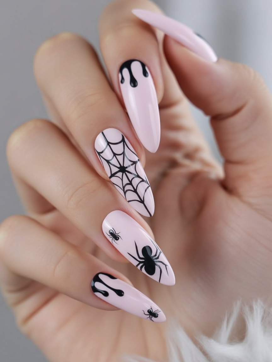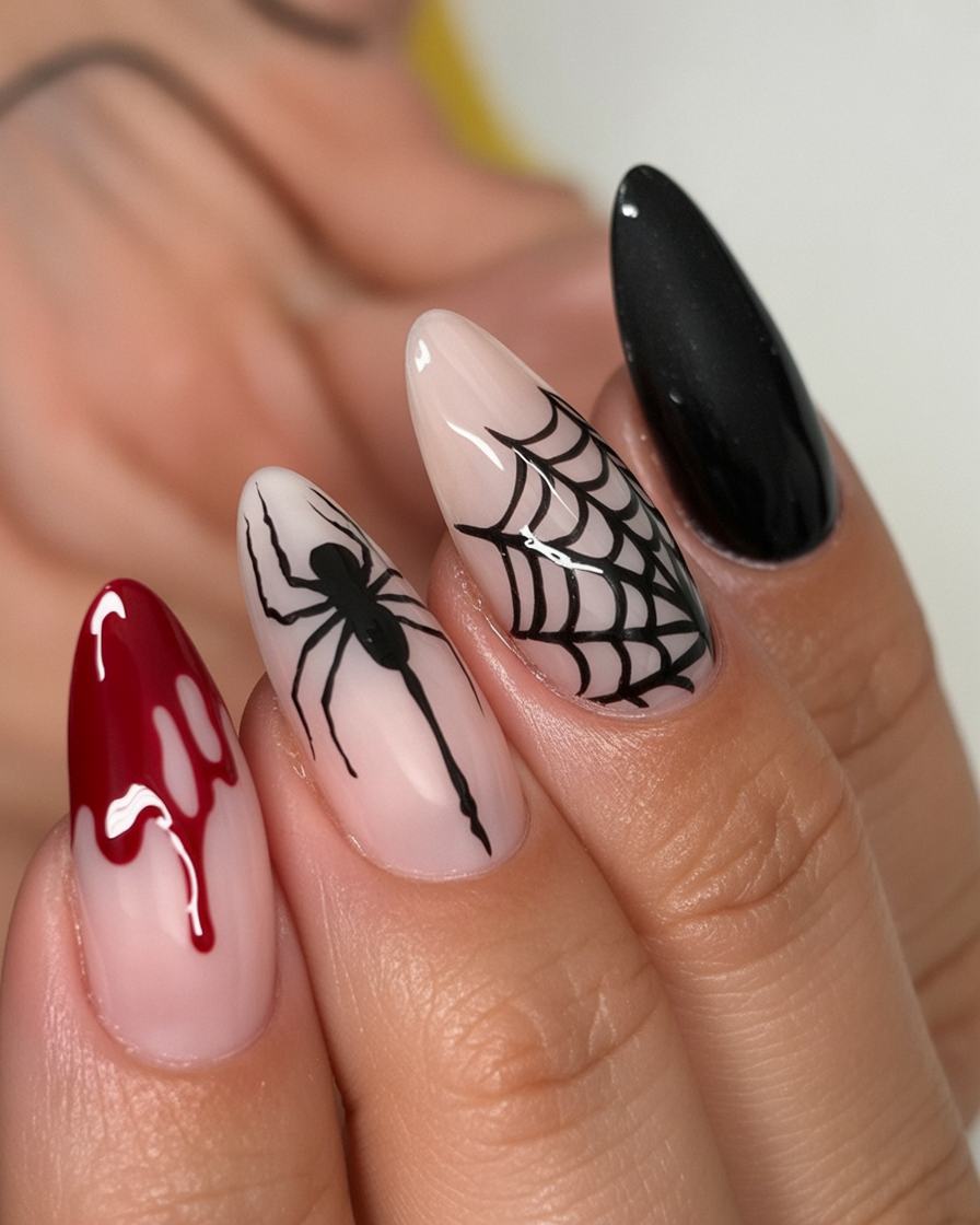 This mani is WICKED Halloween drama: shiny black spiders, fine webs, big white crimson blood-drips on a nude which makes all the details stand out. It’s spooky, sultry, and full of horror-movie flair.