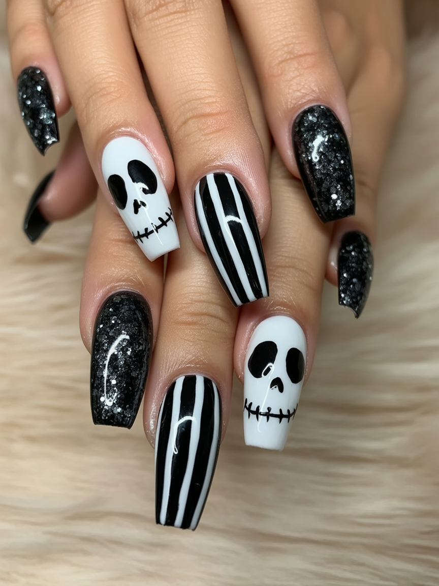 This would have been the Tim Burton-on-nail look. The white skull faces are accompanied by pinstripes and starry black glitter that leaves a touch of beetlejuice magic right at your fingertips. It is both creepy and elegant at the same time, resembling a sort of a haunted fashion week.