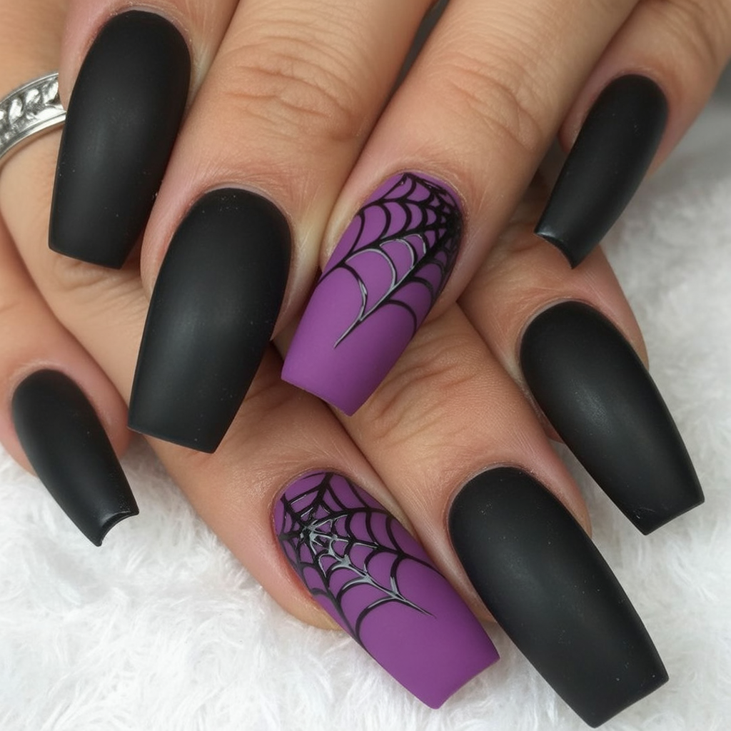 Planed with acrylic coffin/squared nails in mind, it is contrast and texture-oriented. It’s a great option if you’re craving Halloween glam that whispers, not screams.