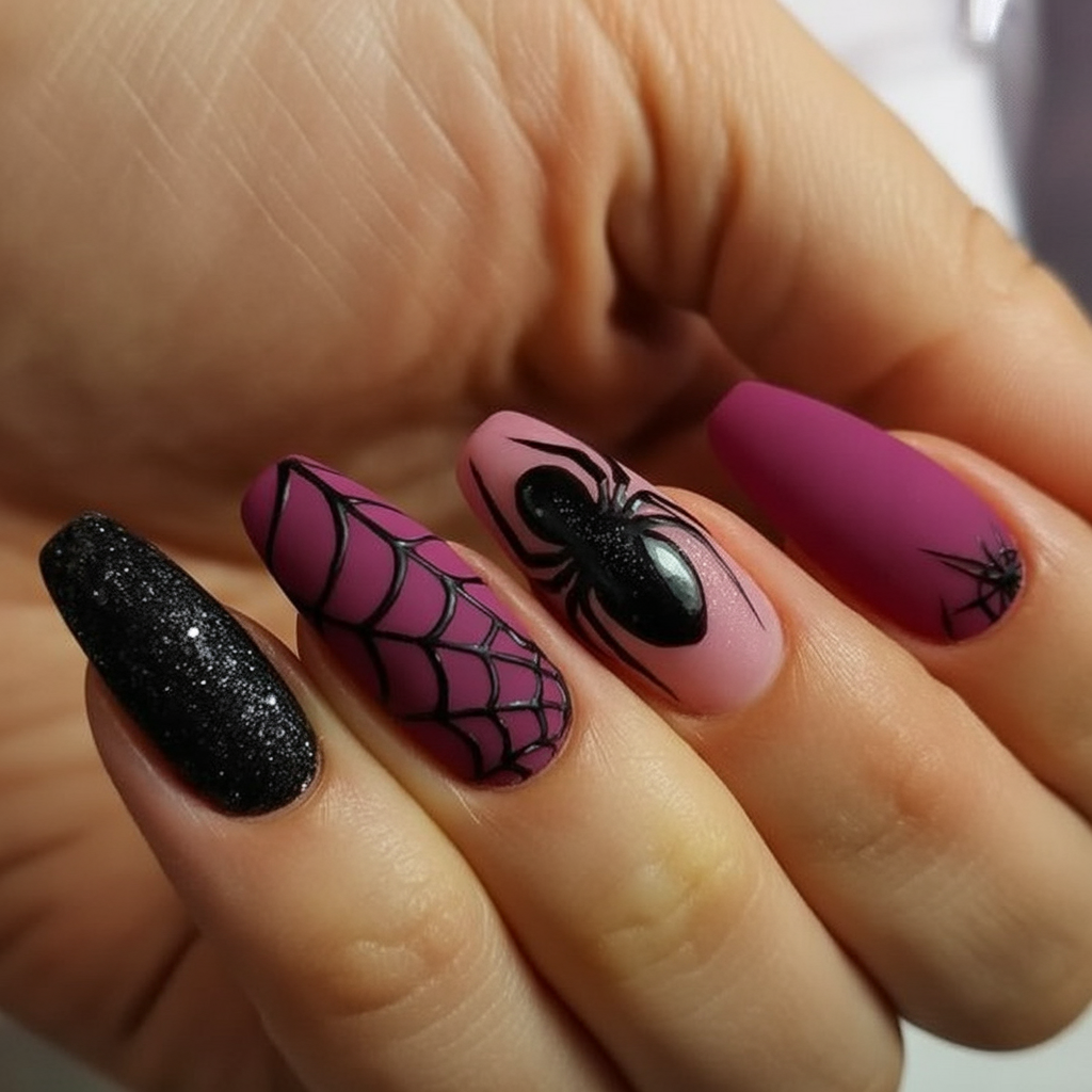 It is not a creation that goes easy on the nervous heart, as it consists of a glittering black and deep pink color, a raised art piece of a spider. These nails are packed with cobwebs and creepy crawlers attached to them making them complete Halloween royalty energy, which is slightly dark, dramatic and drop-dead gorgeous.