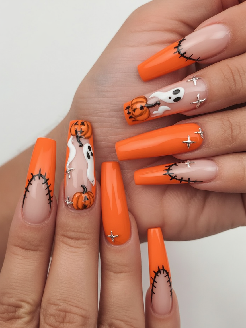 This one’s got everything—stitching, ghosts, jack-o’-lanterns, and sparkles. It’s Halloween as a manicure: cheerful, detailed, and full of spirit. The color scheme consists of orange and black, which remains traditional, but the touches of silver stars and pale pink make it fashionable.