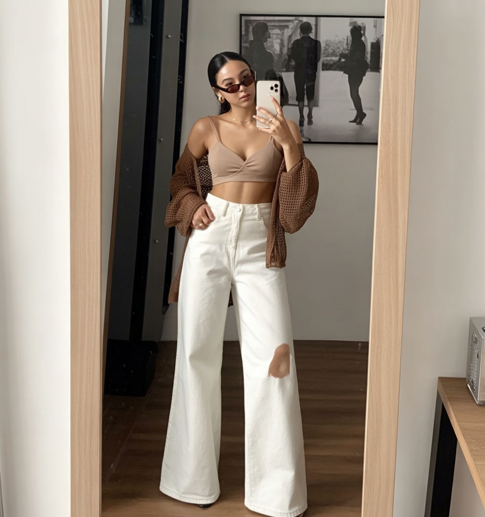 White denim always feels like a fresh start, and this outfit captures that feeling perfectly. The wide-leg jeans paired with a neutral top and cozy layer give off a relaxed, almost effortless charm. It’s cute without being try-hard, and there’s something very calm and confident about it—like you know exactly who you are style-wise.