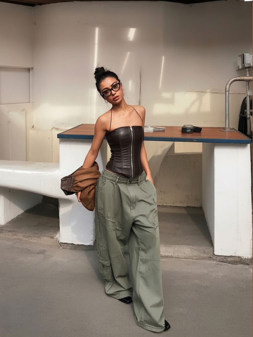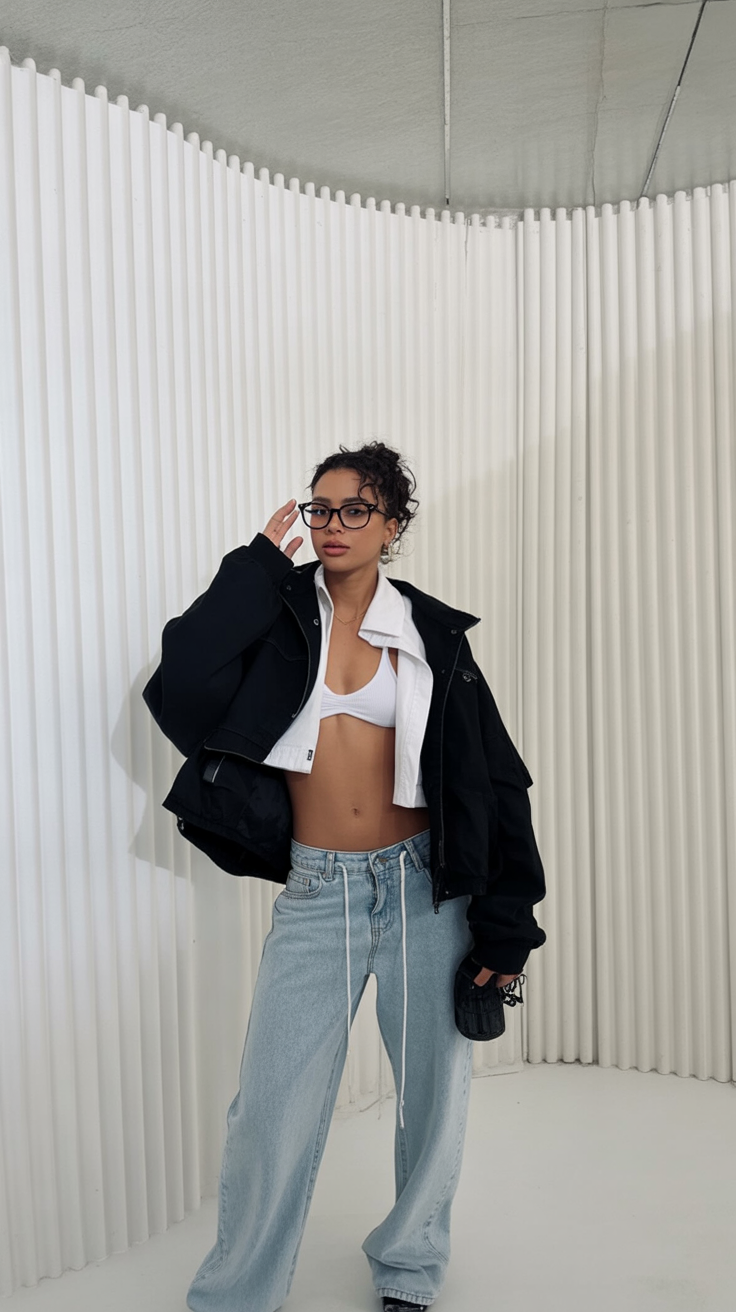 This look leans bold, confident, and unapologetically modern. The baggy jeans combined with a cropped top and oversized outerwear bring a casual-style baddie vibe that feels playful yet powerful. It’s the kind of outfit that turns heads without screaming for attention. There’s something very work-meets-weekend about it—like you could wear this to a creative office and then straight to coffee without changing a thing.