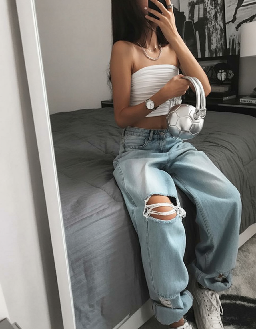 This look feels intimate, relaxed, and effortlessly cool. Distressed jeans paired with a simple top create a laid-back vibe that feels very natural. It’s not about perfection—it’s about comfort, ease, and feeling good in your own skin. There’s a soft, undone aesthetic here that feels honest and modern.