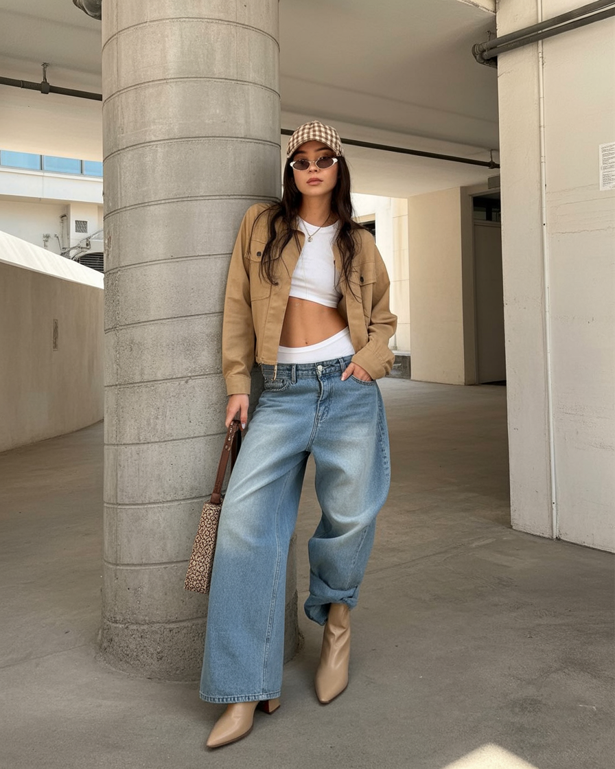 This outfit has a confident, street-style edge that feels fresh and current. The cropped jacket layered over relaxed jeans creates a balanced silhouette that feels playful yet polished. It’s one of those casual-style inspo looks that instantly makes you feel put-together, even on busy days.