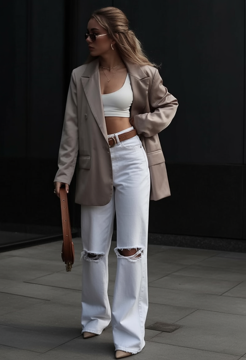 There’s something undeniably polished about white denim styled this way. Paired with a neutral blazer and a simple top, the look feels clean, modern, and quietly confident. It’s classy without being stiff, making it perfect for women who love refined casual styles with a contemporary edge.