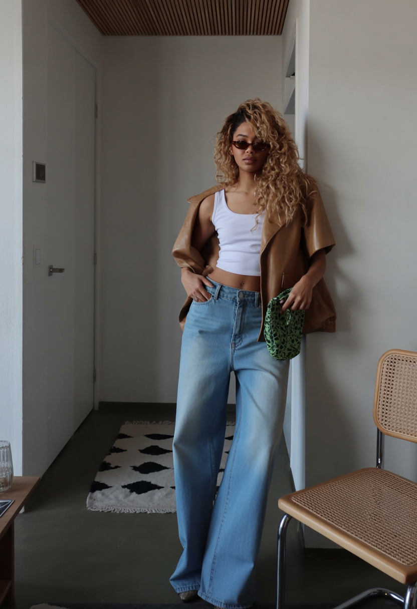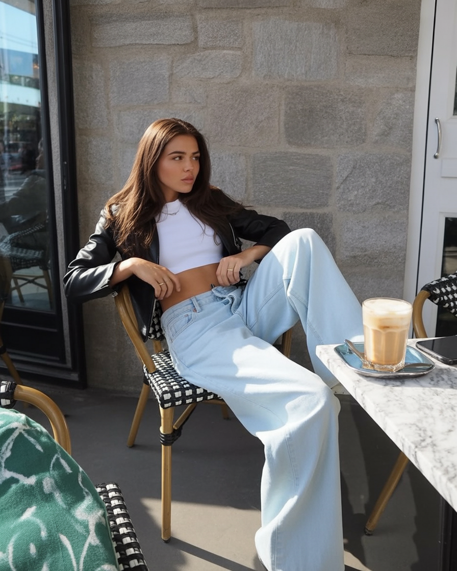 This outfit has that quiet confidence that feels very early spring—when you’re ready to step back into the world but still want comfort on your side. The wide-leg denim instantly softens the silhouette, while the cropped top and lightweight jacket create a balance that feels modern and relaxed. It’s giving casual styles with just a hint of attitude, the kind of look you’d wear when you want to feel cute but not overly styled. There’s a subtle aesthetic here that feels fresh, calm, and effortlessly cool.