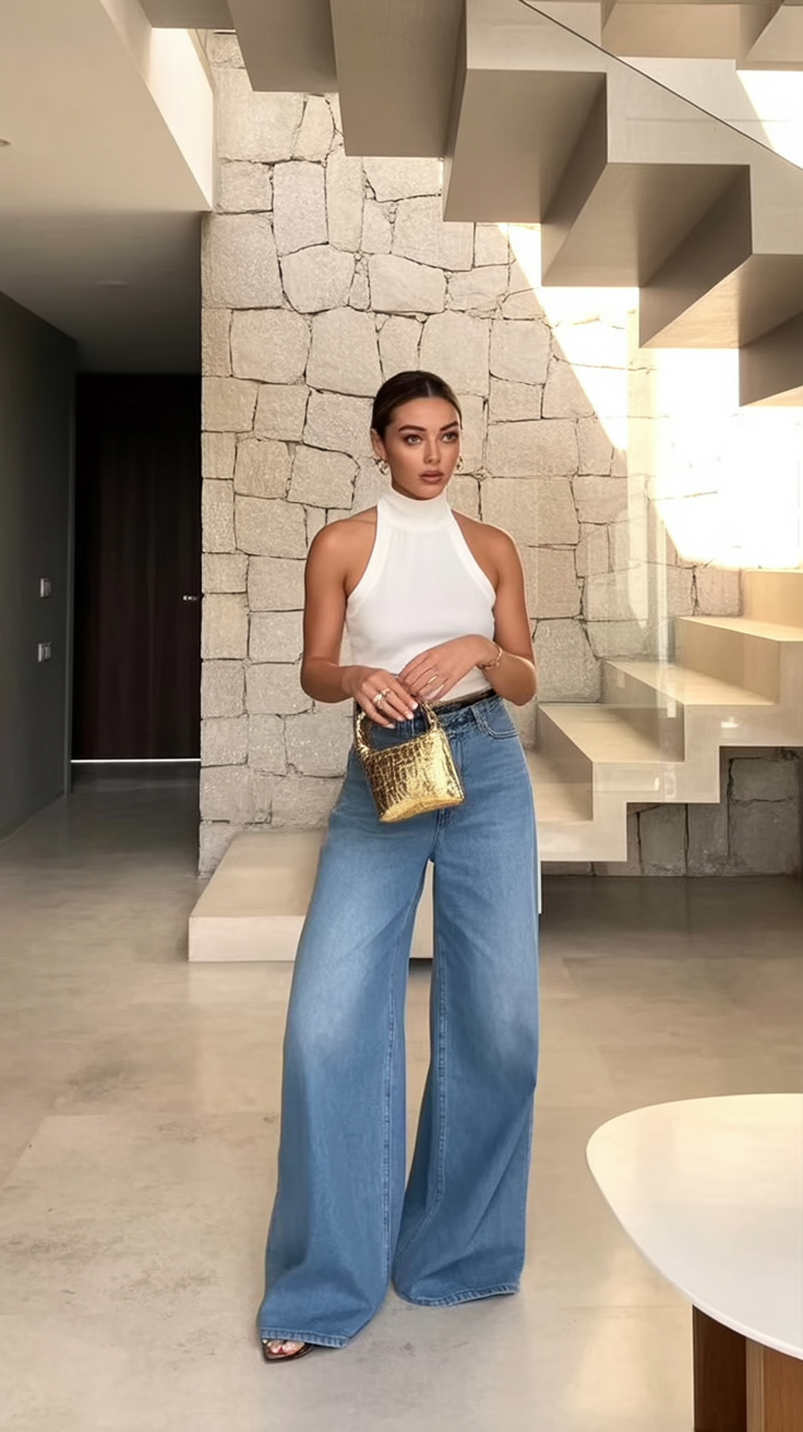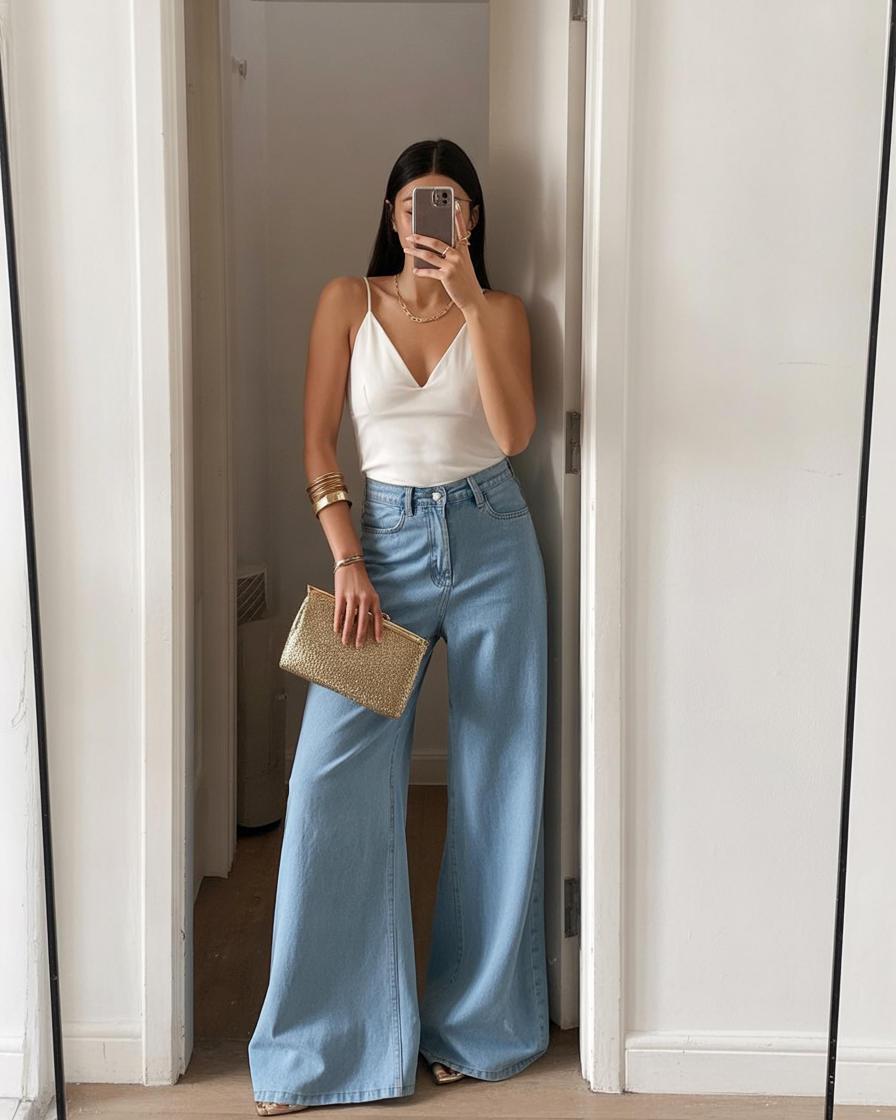 This outfit has a soft elegance that feels perfect for spring evenings. Wide-leg jeans paired with a delicate top create a look that’s light, feminine, and quietly classy. It’s the kind of outfit that doesn’t need much—just clean lines, good denim, and confidence. There’s a calm, polished mood here that feels timeless rather than trendy.