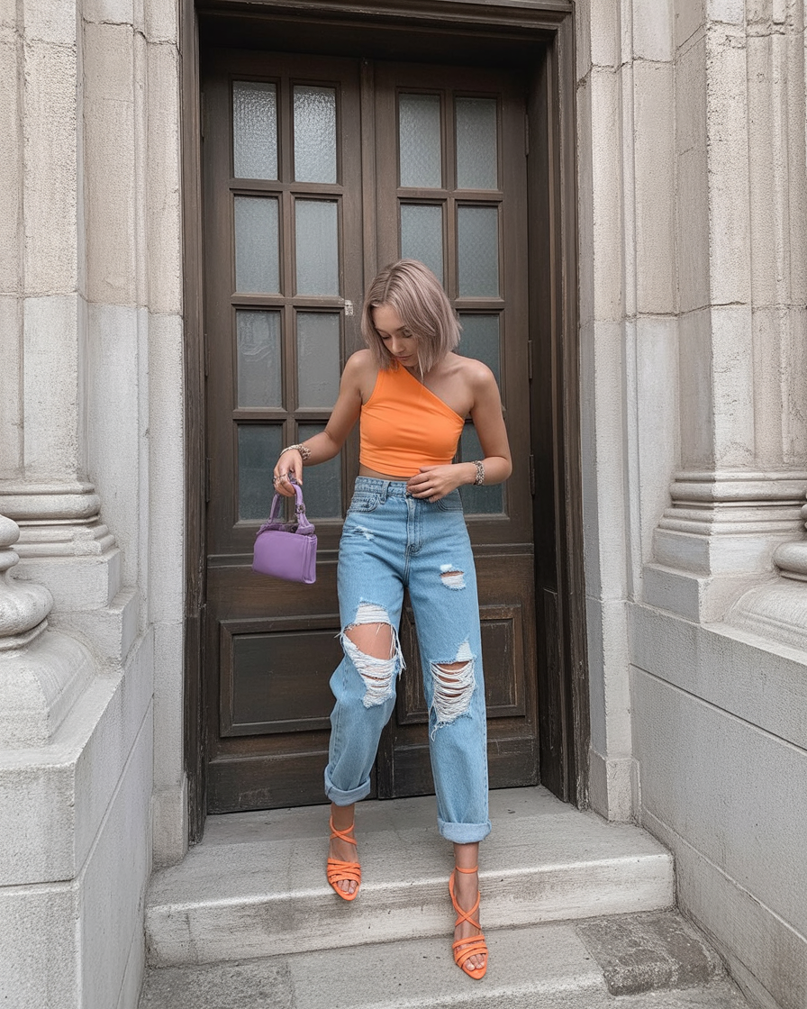 There’s a playful confidence in this look that feels very spring-forward. The ripped jeans bring an edge, while the bright top adds energy and personality. It’s cute, bold, and full of inspo for anyone who loves mixing casual denim with statement pieces. This outfit feels spontaneous—like something you’d wear on a sunny afternoon when you’re meeting friends and don’t want to blend into the background.