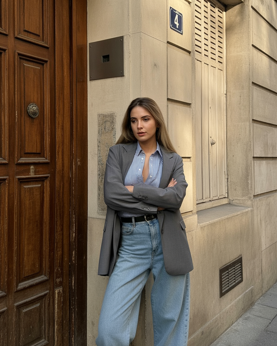 This outfit feels like confidence wrapped in denim. The combination of relaxed jeans and a tailored blazer creates a look that’s strong, polished, and still approachable. It’s the kind of outfit that makes you stand a little taller—perfect for days when you want to feel capable and stylish at the same time.