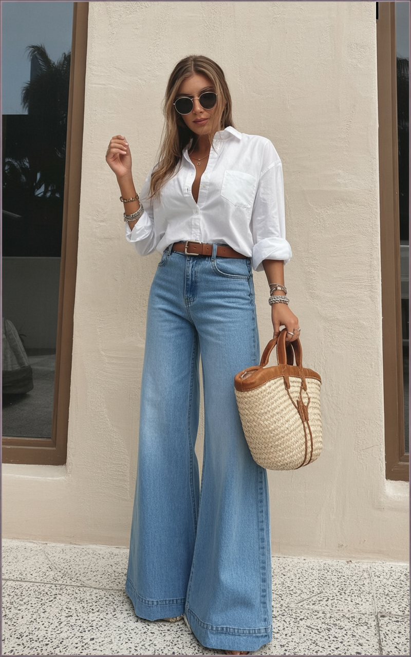This outfit feels like that perfect spring morning when the air is crisp but the sun is finally warm. Wide-leg jeans paired with a clean white button-down instantly create a look that’s effortless, confident, and quietly classy. It’s not loud or trendy in an obvious way—it’s the kind of casual style moment that always looks right. The structured denim balances beautifully with the relaxed shirt, giving off a polished yet approachable aesthetic that works at any age.
