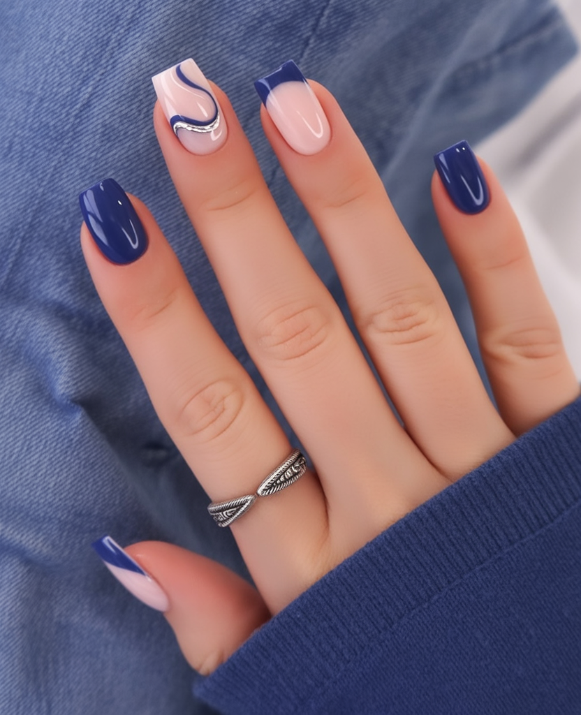 Sometimes you just can’t choose between standard and artistic designs. That’s where this nail design comes in. Navy tips with a swirling design bring both elements together. Half-silk, half-jean is nothing compared to this fashion statement. This collection is ideal if you’re ready for short designs without compromising on interest. It’s ideal for those with prominent nail beds or for individuals with nails that need TLC via a growth process. Additionally, it exudes a charming 70s touch, which is super popular in nail design trends for 2026.