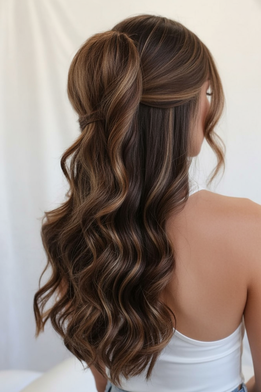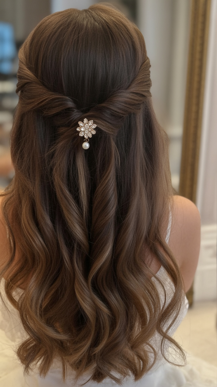 The half-up hairstyle introduces the ideal balance of elegance and comfort. It gives you the I-just-left-a-blow dry look with its clean twist and weighty curls; though you did not even step into the salon. There is no make-up and yet it is chic without making much effort about it and that is the beauty.