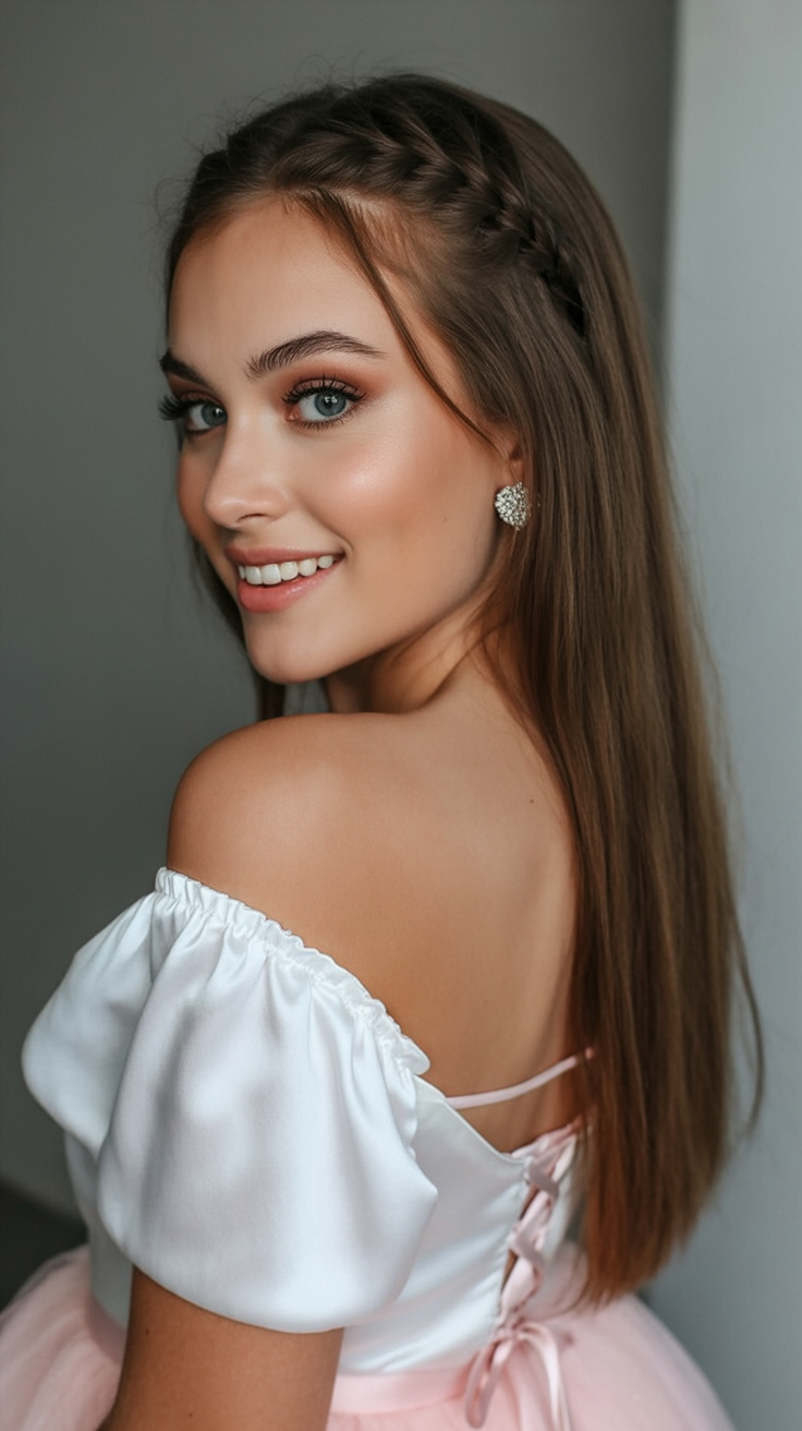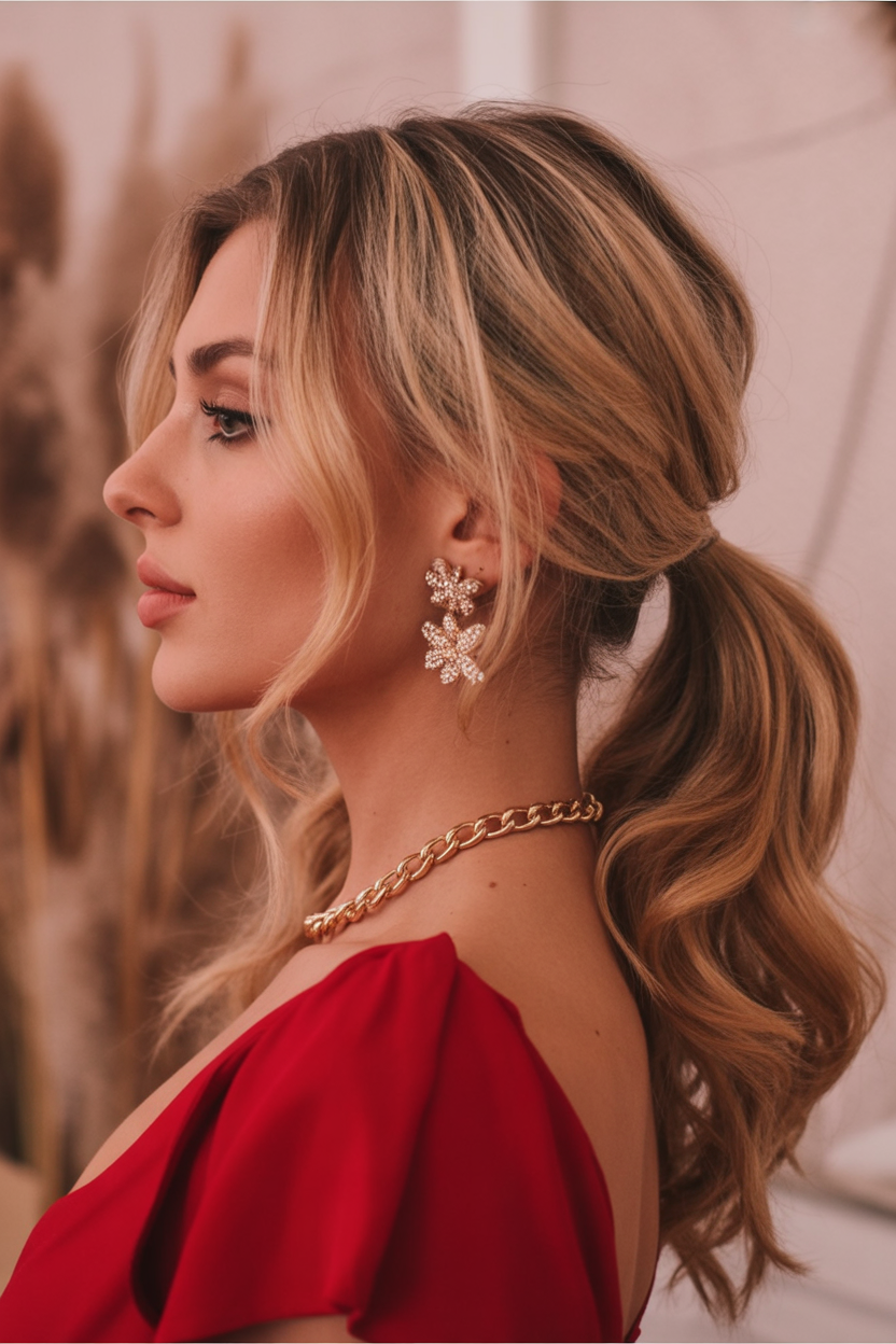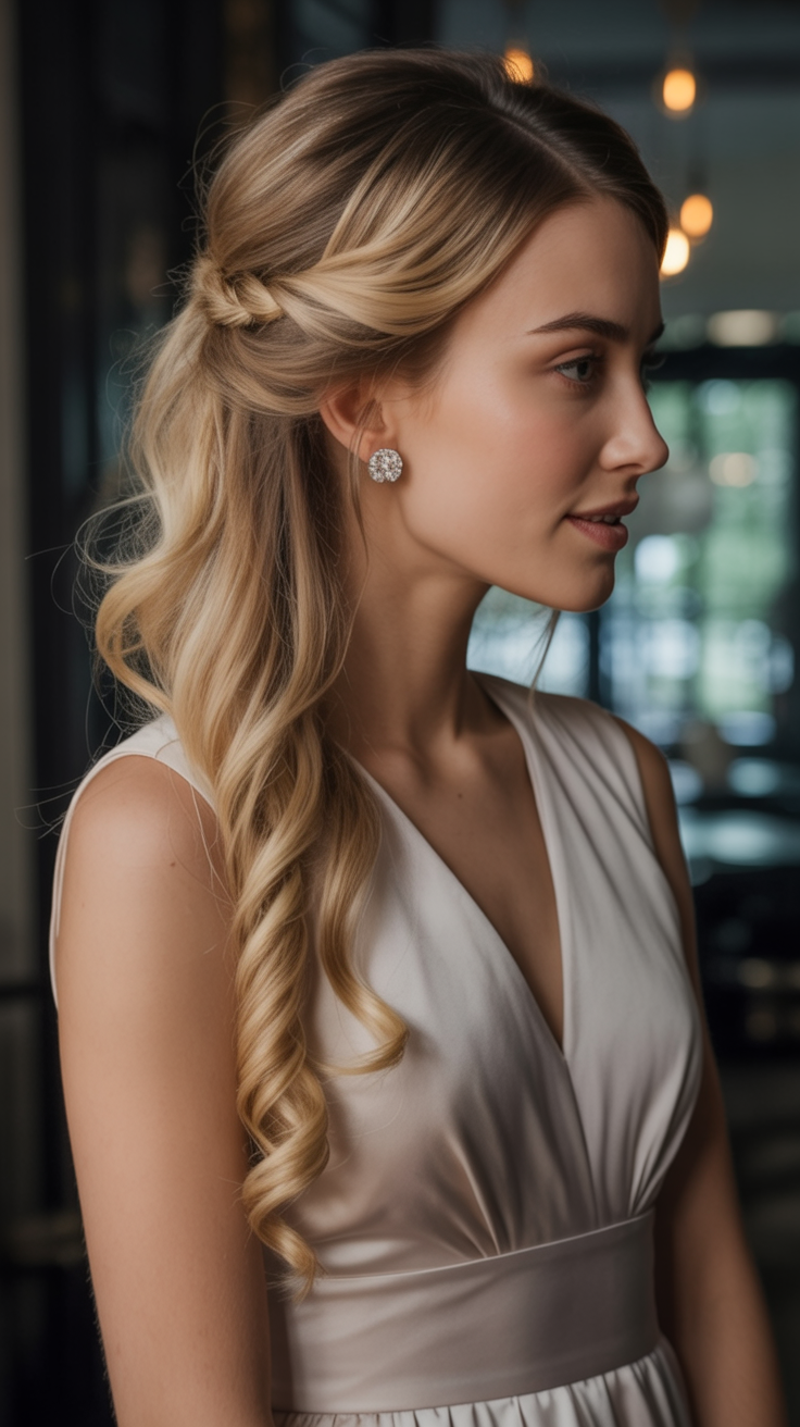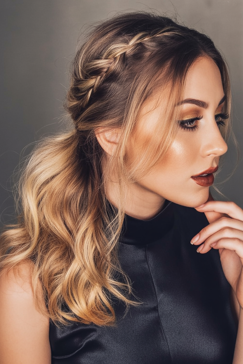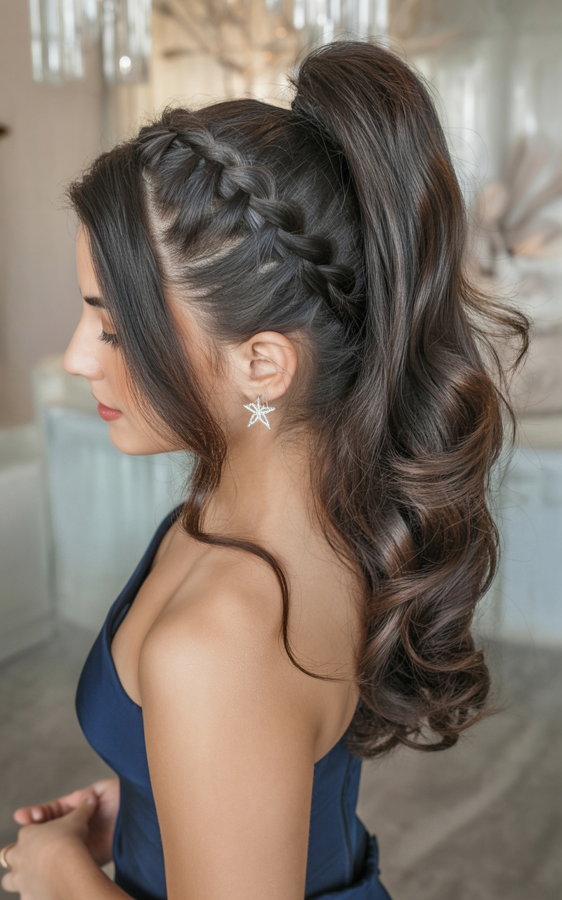 This is classic glamour merging with a modern edge into a type of side ponytail with braided details. The retro-style curvy bangs harken to the evenings in their scream and the braid offers that air of fun making it ideal to wear on special occasions or a sense of homecoming.