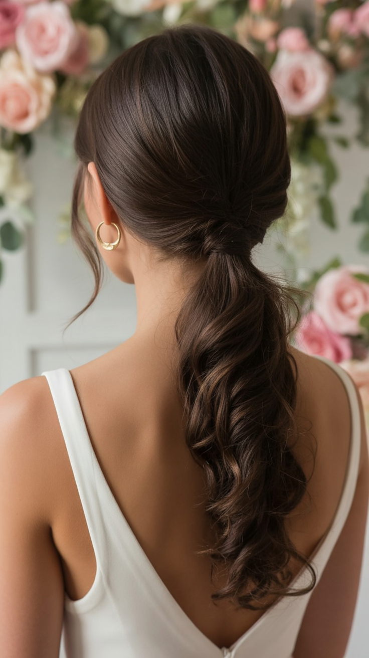 It is elegant yet sleek, a pony tail pulled back with tucked edges and curvy tendrils deliver a lot of class. It is soft, romantic, and a perfect fashion when you want to display your neckline or statement earrings.