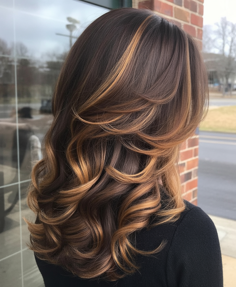 And then, there is the perfect marriage between sophistication and warmth—that would be deep chocolate curls with subtle caramel threads. Such a hairstyle tends to have an almost luxurious look with ample substance, yet it also boasts a subtle shine that tends to highlight curls for an exquisite look that is rich in allure with an invigorating effect on the eyes. This one’s especially flattering for thick or wavy hair. It adds structure and shine without losing the hair’s natural body. Use a curling wand for polished waves, or brush them out for a softer, more romantic vibe. The mix of dark chocolate and caramel hues gives depth that enhances any skin tone—perfect for anyone wanting a timeless update that still feels new.
