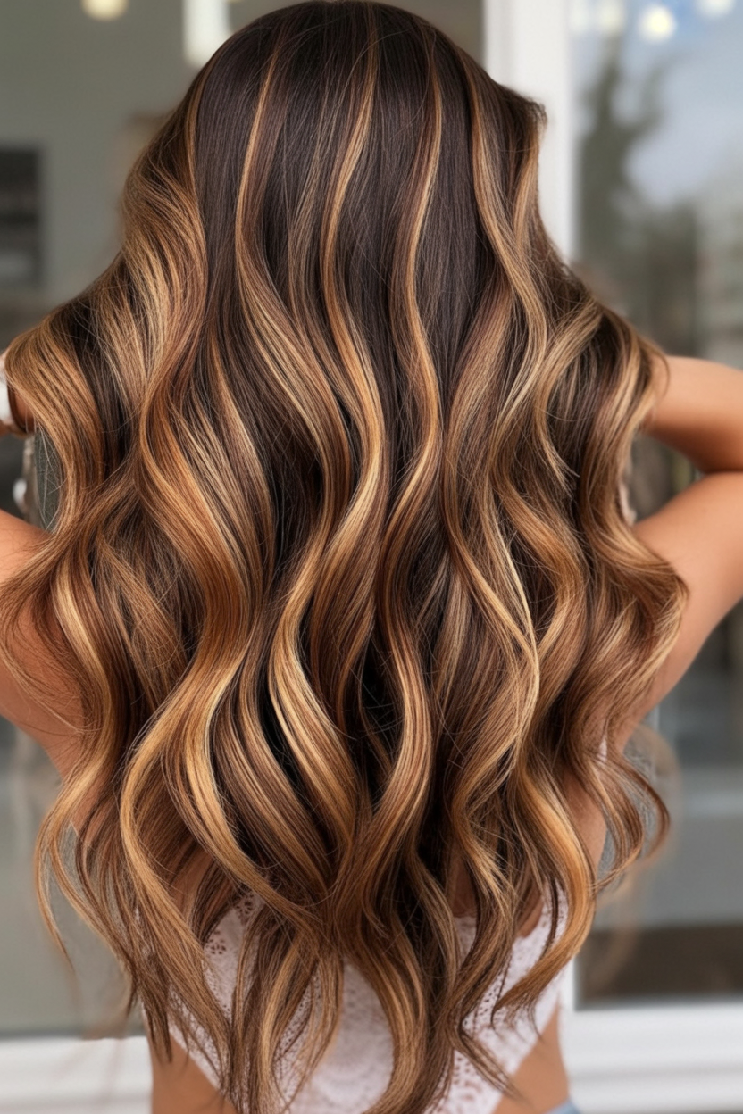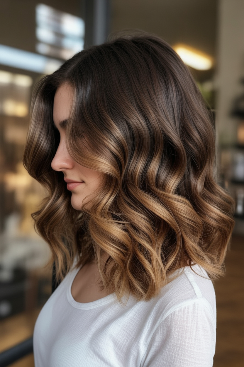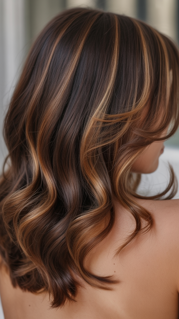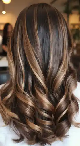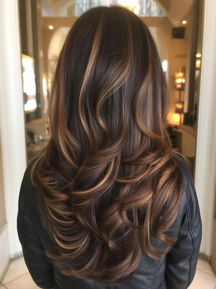 This cut shines on long or medium-length dark hair with natural waves. The golden tones flatter warm complexions beautifully and make every curl or flick pop. Try a gentle round-brush blowout and finish with a lightweight oil to enhance the rich mocha sheen—ideal for special occasions or everyday glamour.