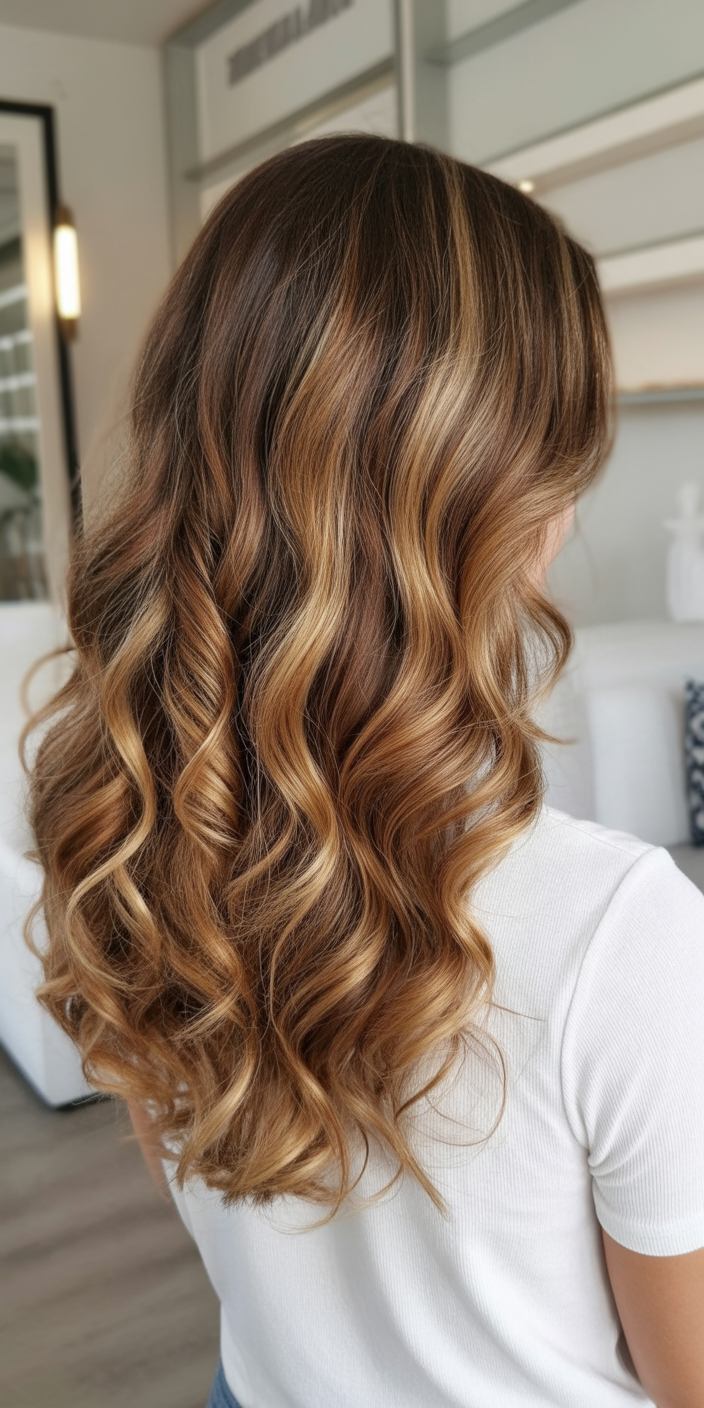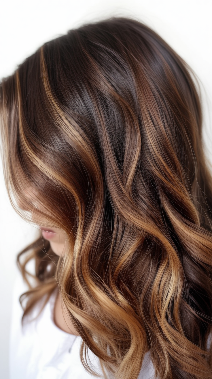 Ideal for long, thick, or curly hair types, this look enhances dimension and adds natural body. The golden tones brighten deep chocolate roots while preserving depth, making it a striking yet wearable style. Use a hydrating serum to maintain shine and curl definition—especially on dry ends—to keep your color vibrant and silky between salon visits.