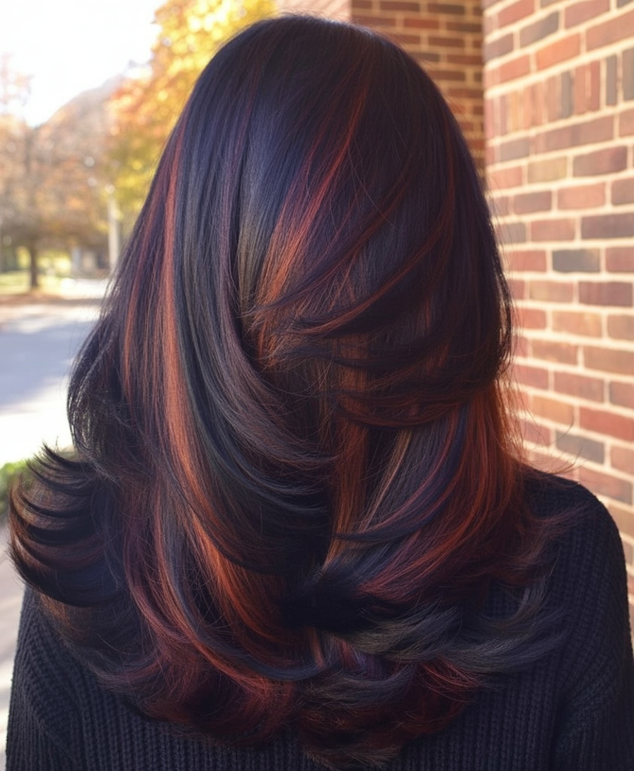 Here’s a bold twist on classic espresso hair—deep, dimensional layers kissed with subtle red caramel streaks. It’s daring without being loud, adding warmth and mystery to every strand. This is the kind of color that looks even better in motion, catching flashes of auburn in the light.