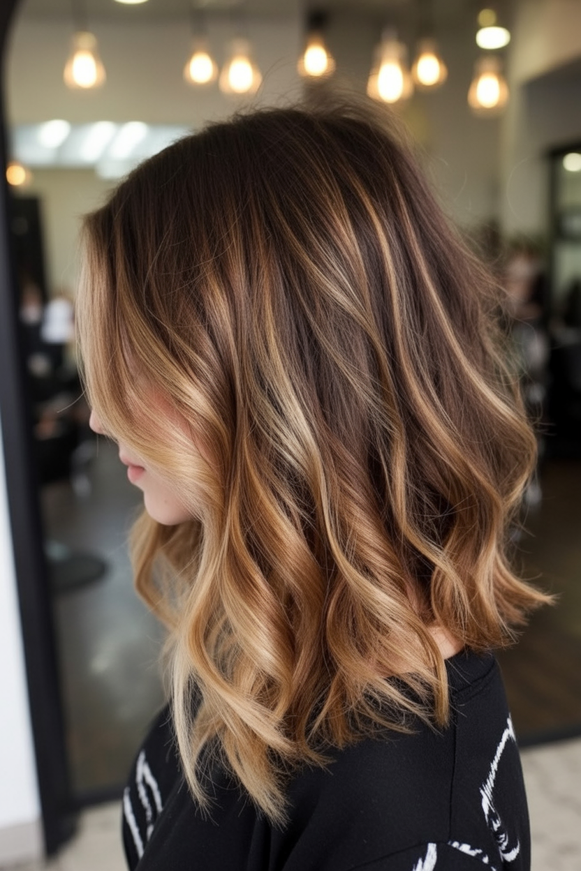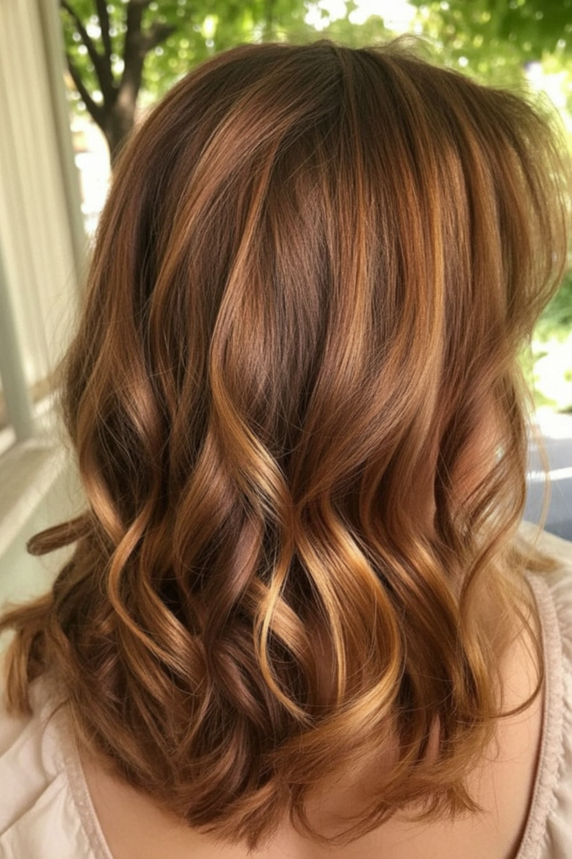 6. Deep Chocolate Mid-Length Waves with Caramel Lowlights