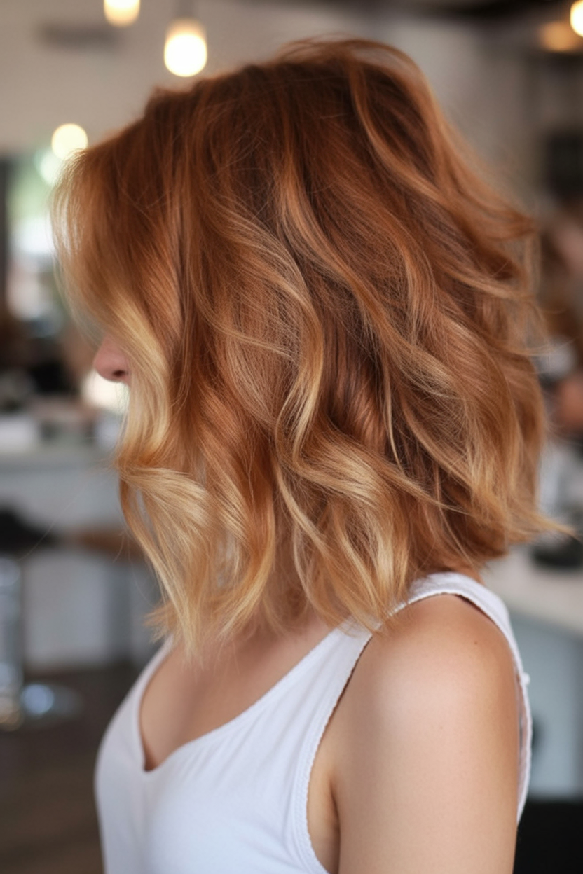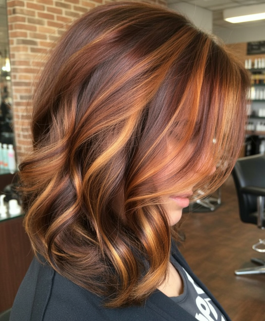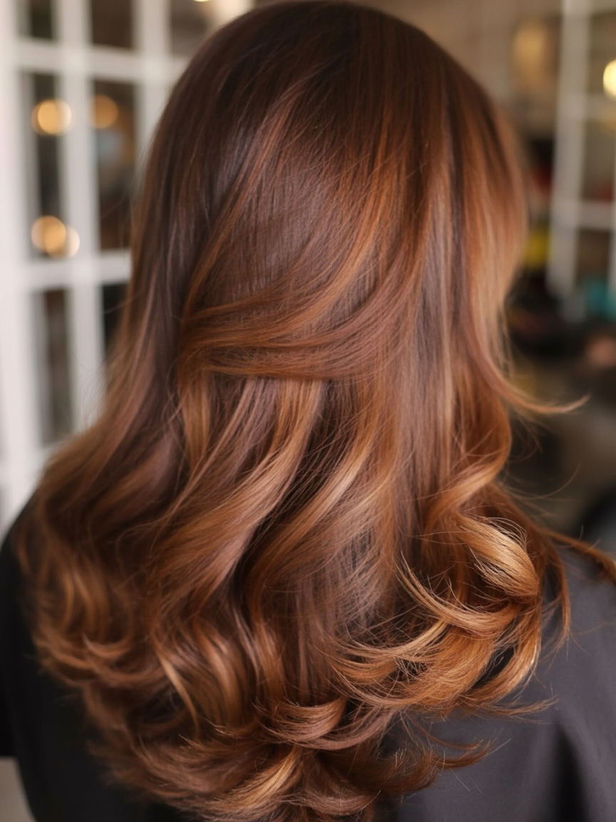 Fiery yet elegant, this auburn balayage with caramel ribbons adds warmth and radiance that feels alive. The soft bangs frame the face just enough to bring a touch of mystery, while the rest of the cut flows in glossy, voluminous waves. It’s bold but not loud—a confident, sunlit take on the classic medium brown that feels romantic and utterly wearable. Best suited for medium-thick hair, this style gives you that effortlessly styled look with minimal effort. The reddish-brown base enhances eye color, while the caramel highlights add depth and glow. For the best finish, use a light-hold spray to maintain bounce and shine throughout the day—ideal for women who love that lived-in yet refined energy.