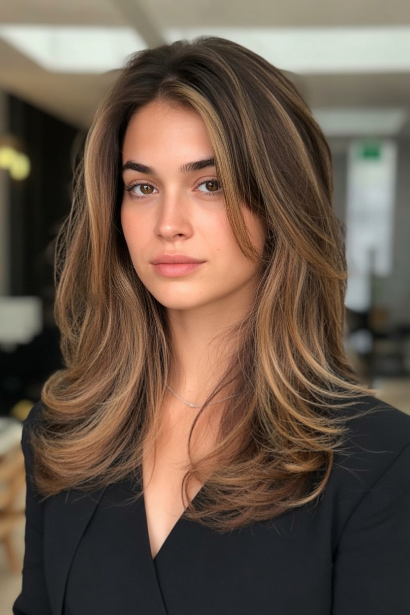 This voluminous cut suits medium to thick hair best and works wonders for those who crave bounce. The honey tones soften a dark base while keeping it chic and dimensional. Use a large-barrel brush and blow dryer to lift the roots, then finish with a glossing serum for that deep chocolate shine that lasts all week.