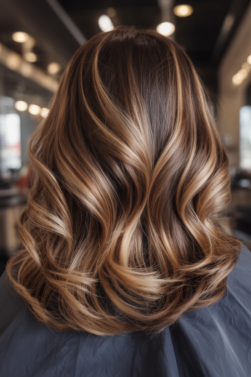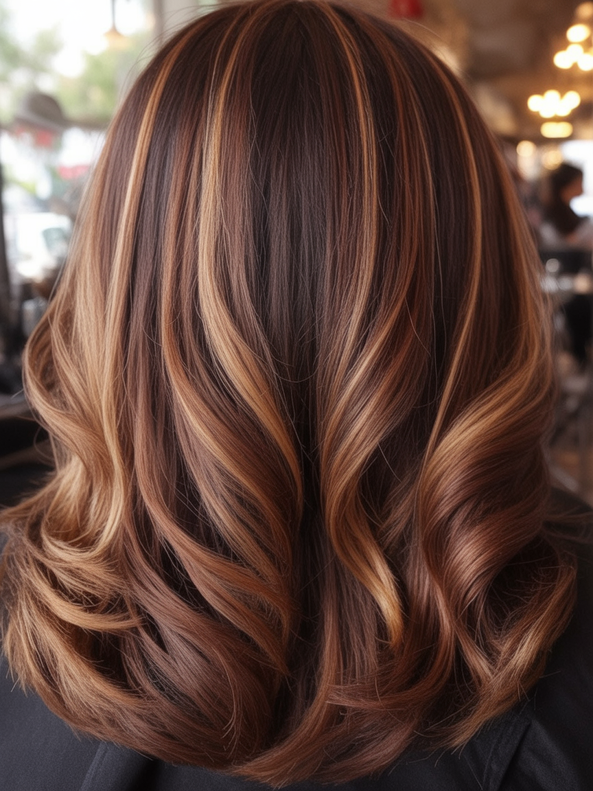 If rich, salon-fresh glam had a name, it would be this chocolate swirl blowout. The glossy brown base melts seamlessly into honey lowlights, adding movement and luminosity to every wave. The result is refined yet vibrant—a look that says, “I’ve got things to do, but I’ll do them beautifully.”