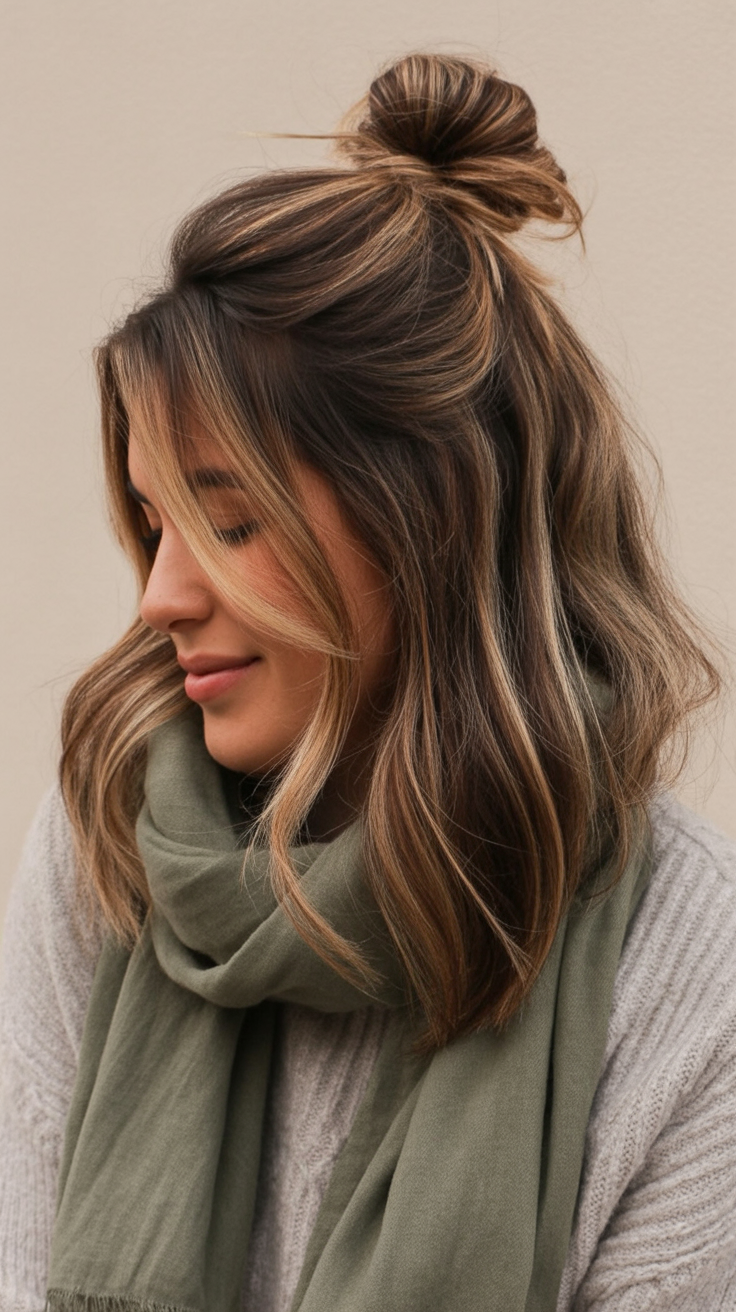 This playful half-up style turns the classic bob into something effortlessly cool. The mocha base brings depth, while blonde money pieces illuminate the face, giving a touch of glow even on no-makeup days. It’s that casual yet chic vibe—like throwing your hair up and still looking perfectly put together.