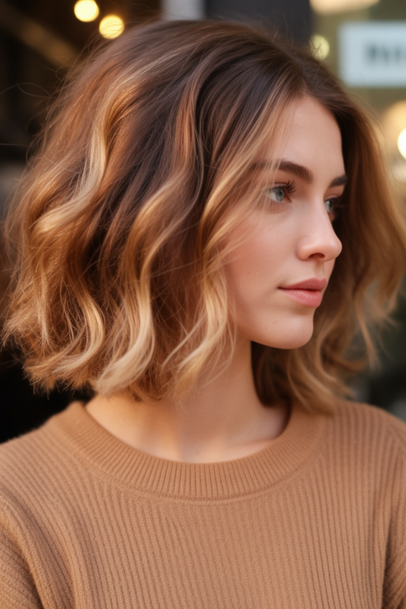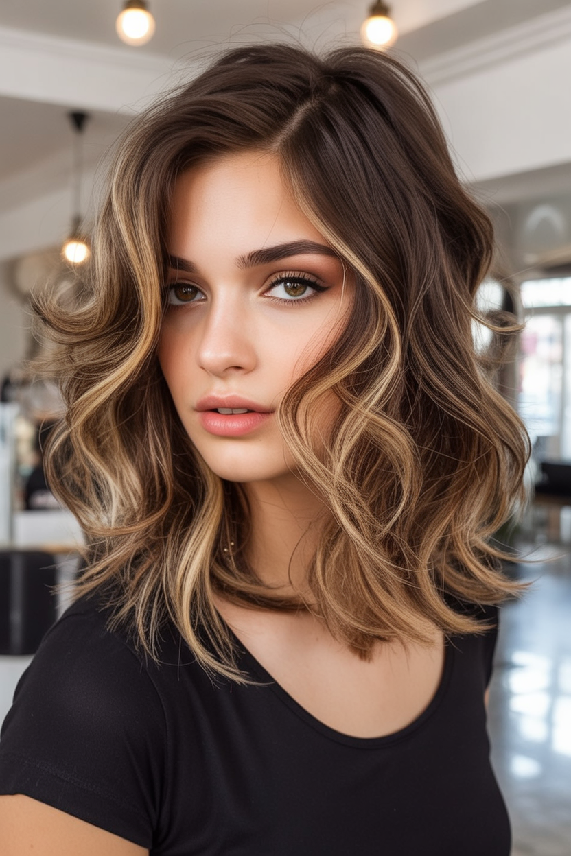 This caramel balayage lob is pure modern elegance—effortless, glowing, and flattering from every angle. The soft curls flow naturally, blending light honey ribbons with a deep brown base to create a color that feels sun-touched yet completely polished. It’s that perfect balance between laid-back and luxurious, radiating confidence and warmth without going over the top. Ideal for medium or fine hair, this style works wonders if you’re after low-maintenance beauty. A bit of sea salt spray or dry texture mist keeps those waves in place all day. The caramel tones add depth and a natural lift to the face—especially for women with olive or warm undertones who want a fresh, easy glow.