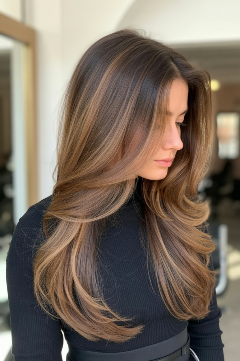 This style flatters thick or medium hair best, especially when styled with a large round brush to lift the layers and showcase the movement. The caramel tones enhance dimension, making this cut ideal for those who want to brighten dark or chocolate bases without going fully blonde. Keep the ends hydrated with a lightweight serum for that rich, glossy finish that looks salon-fresh every day.