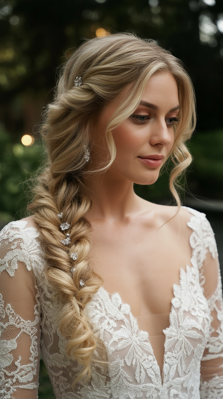 The combination of side-swept curls and a glittering hair comb gives out the vibe of a glamorous old-Hollywood bridal image. This style makes one side of the face the focus and thus statement earrings or dramatic neckline can be effortlessly displayed. It is refined, feminine and feels as though it belongs in a girl evening wedding.