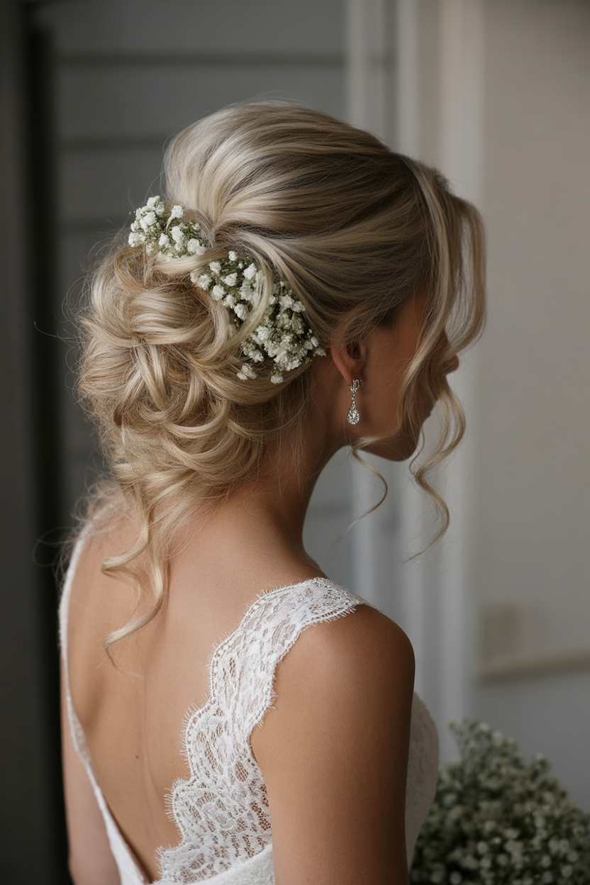 4. Low Textured Bun with Baby’s Breath