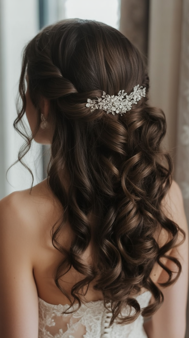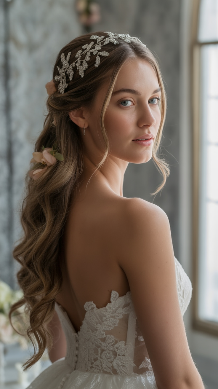 There is something about the idea of glossy, rippling waves dotted with a headpiece of crystal embellishment that makes fairytale look like something real. This style embodies the traditional bridal style and gives it a hint of 2025 trends by its smooth, yet natural blend. The entire ensemble is regal because of the headpiece especially to a bride that wants to make herself to feel like royalty.