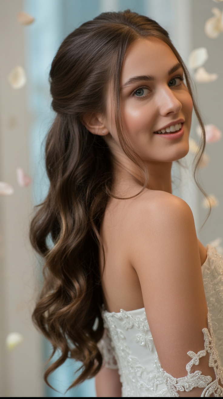 It seems soft, cascading waves that are pulled into a half-half up style are timeless. It is simply romantic, importunately as she has only come up out of a fairytale. The elevated crown brings the light touch of grace, and the sloping waves surround the shoulders highlighting its femininity with a light touch. Especially ideal when a bride wants that classic element of glamour combined with the natural effortlessness, this look seems to maintain the special ability to make you feel classy yet relaxed simultaneously.