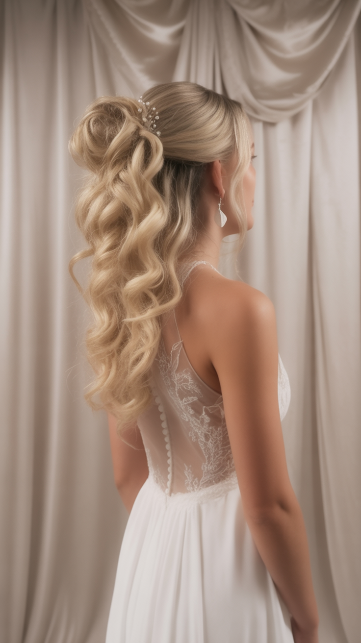 23. Luxe Blonde Waves in a Curly Ponytail