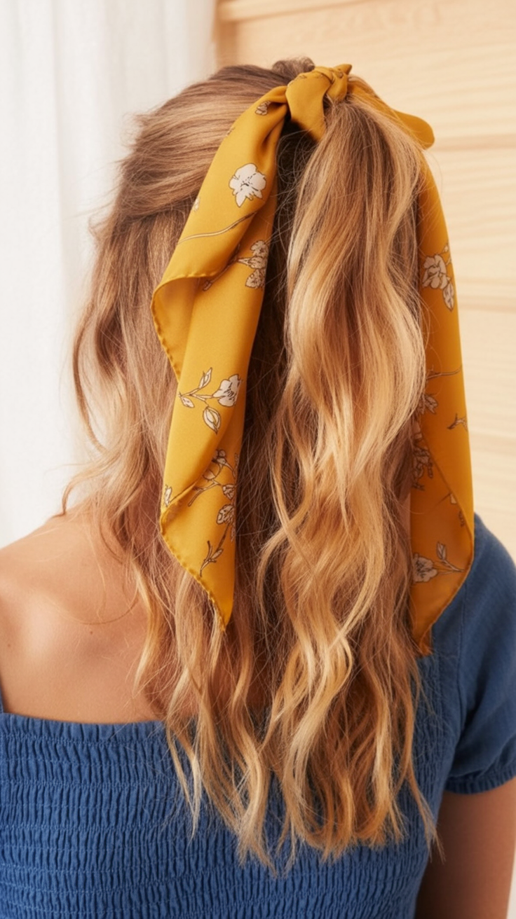 The style is ideal with medium and long hair, most particularly wavy or loosely curly hair types. Tie scarf around the nape of the neck and tie it on top or side to fit. In order to keep shine and softness, apply light smoothing serum and then styling. It is the kind of hair style which did not just complement your appearance, it boosted your entire mood.