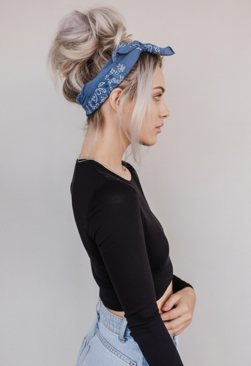 It suits every hair type, but it is especially pretty for women with layered hair cuts when the loose strands will frame the face perfectly. Tie the bandana above bun with a playful touch. It goes perfectly with some denim overalls or casual cotton dresses so it is one of our favorites to wear on a picnic, to a festival or any day that ends in sunset.