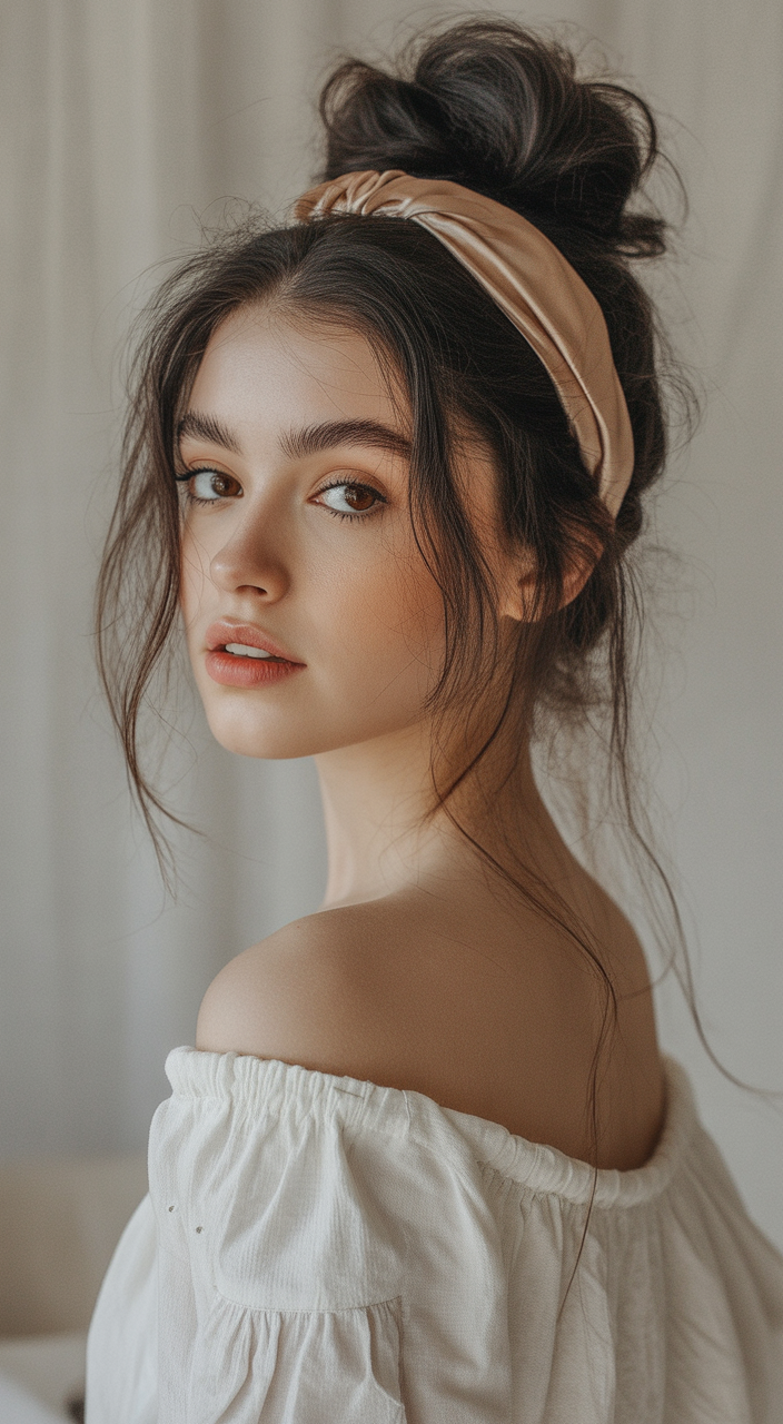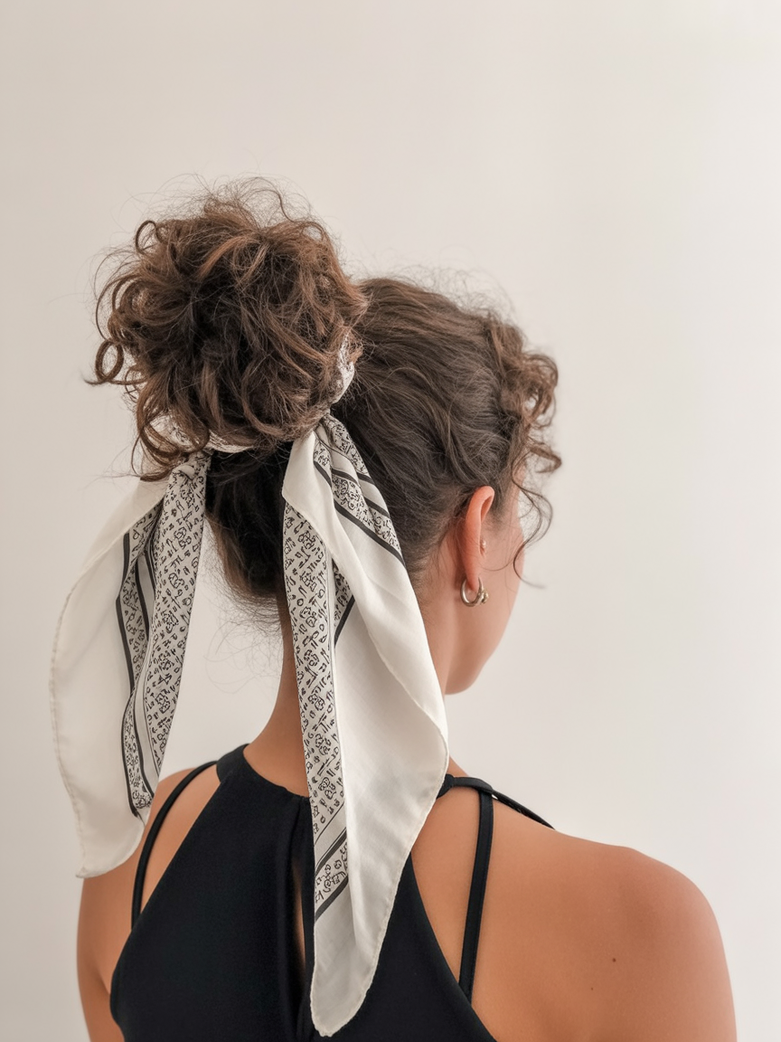 This is of best advantage to Curly hair because the texture adds bouncy texture to the bun. Fold the scarf on yourself and then leave the ends hanging out to move. It is something new in contrast to the usual hair ties, and is ideal to keep the locks up without sacrificing softness.