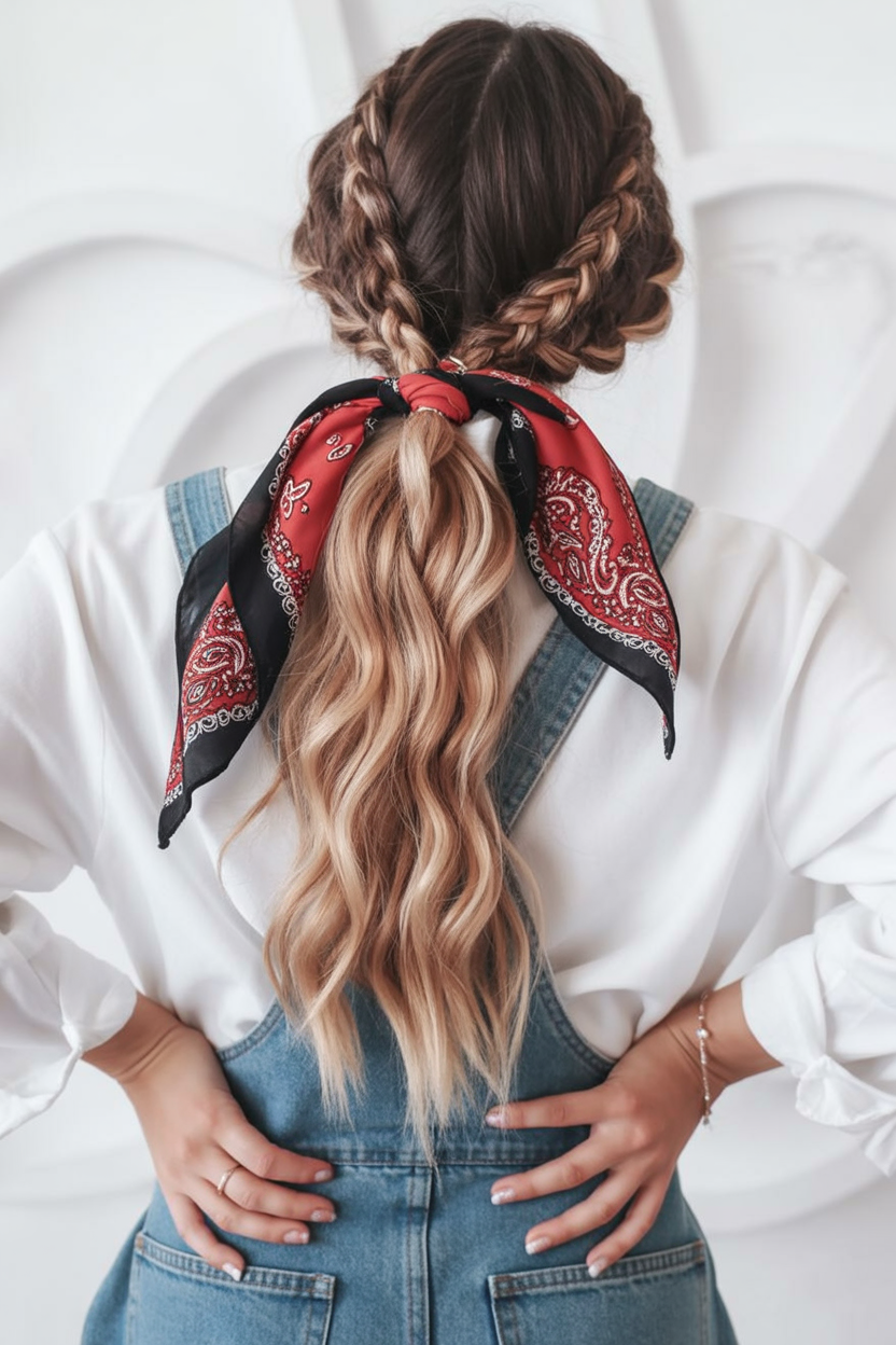 This is a combination of the braids and long hair that is tied on the low pony set off with an outstanding red bandana hence it is a definitive statement at first impression. It is fun but purposeful, and a bit of a western-style touch that is equally-appropriate at a music festival, or a simple day in town. This has a bit of nostalgia, a little to childhood braids, having all grown up and sophisticated.