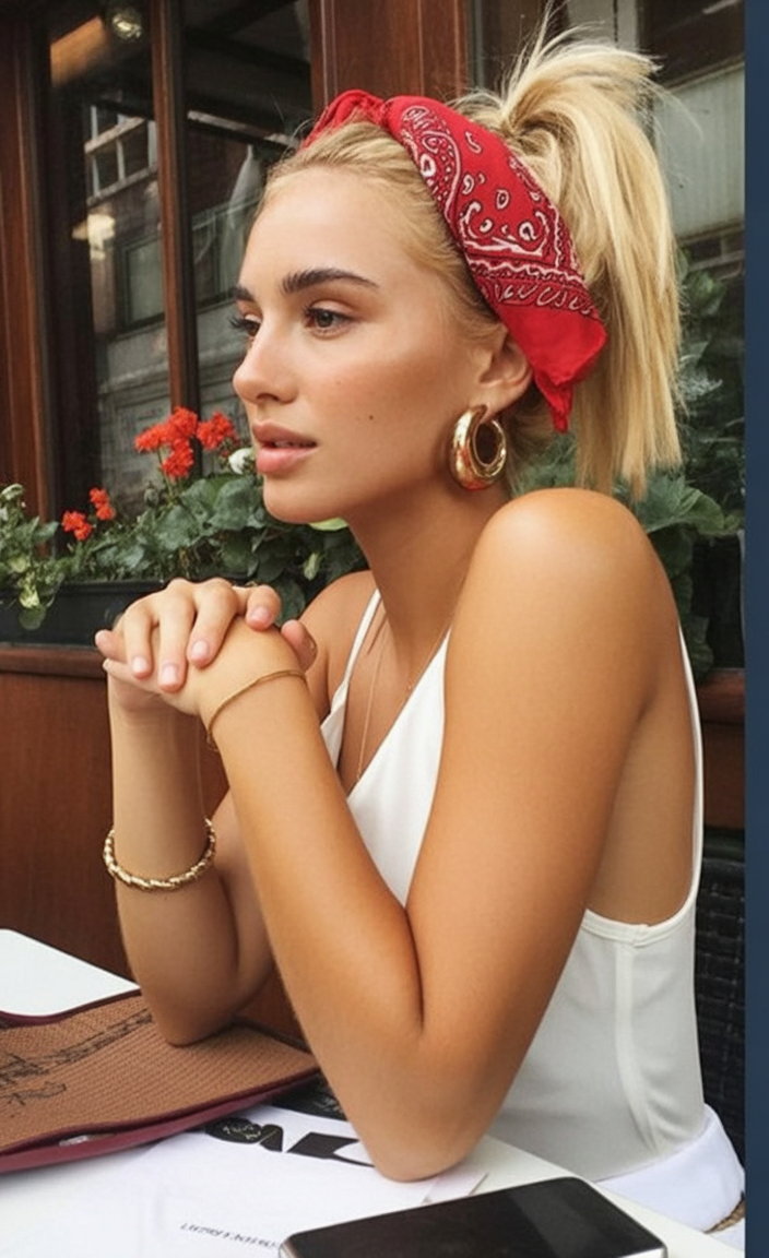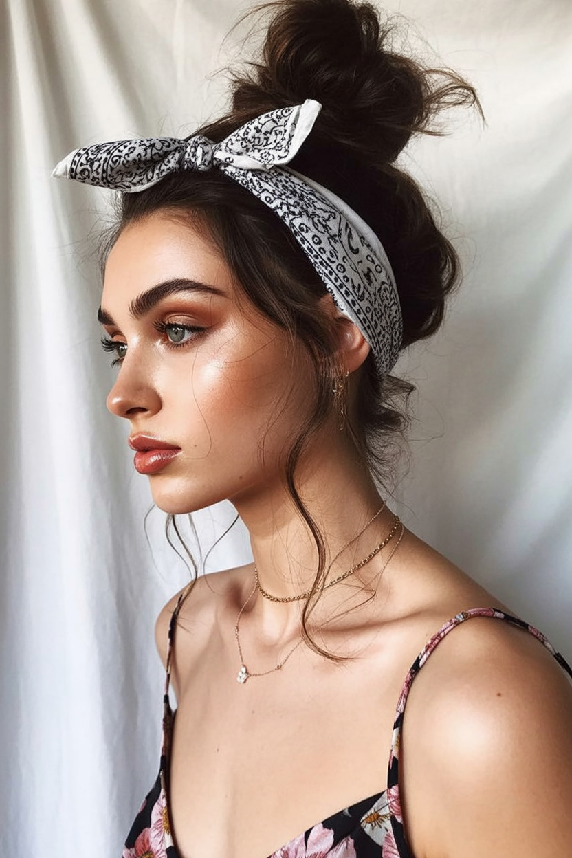 A sloppy high bun is immediately styled up with a traditional bandana. The paisley print makes it have this laidback, Western feel and the face-framing soft strands make it feminine and easy to get along with. It is a casual-semi appearance that nevertheless seems purposeful enough, suitable as a weekend date to get a coffee or spending a sunny Sunday at the park.