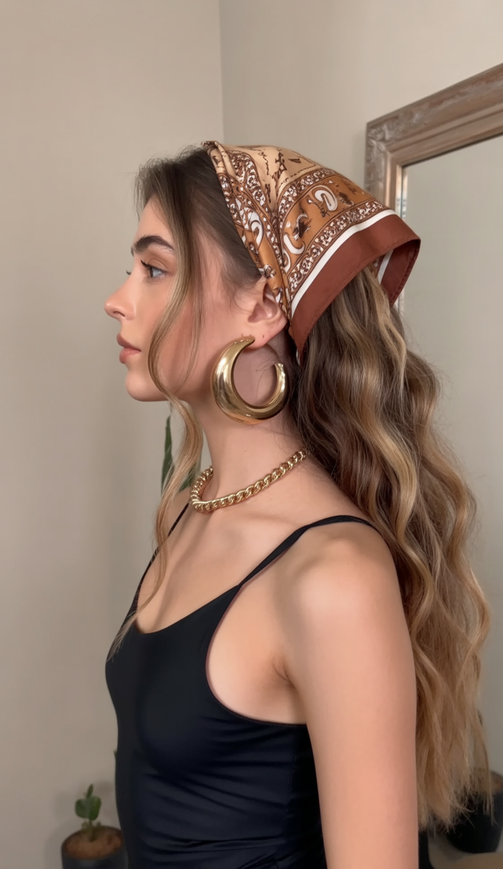 The style compliments wavy hair most but straight or a little curly also takes it to a wonderful shape. Pull all your hair up into a high or mid pony and tie the scarf so that it holds safely and the sides can mix with your waves. It goes with an off-the-shoulder top to get a heavenly, Western feel, or with a sundress to shoot off to your picnic.