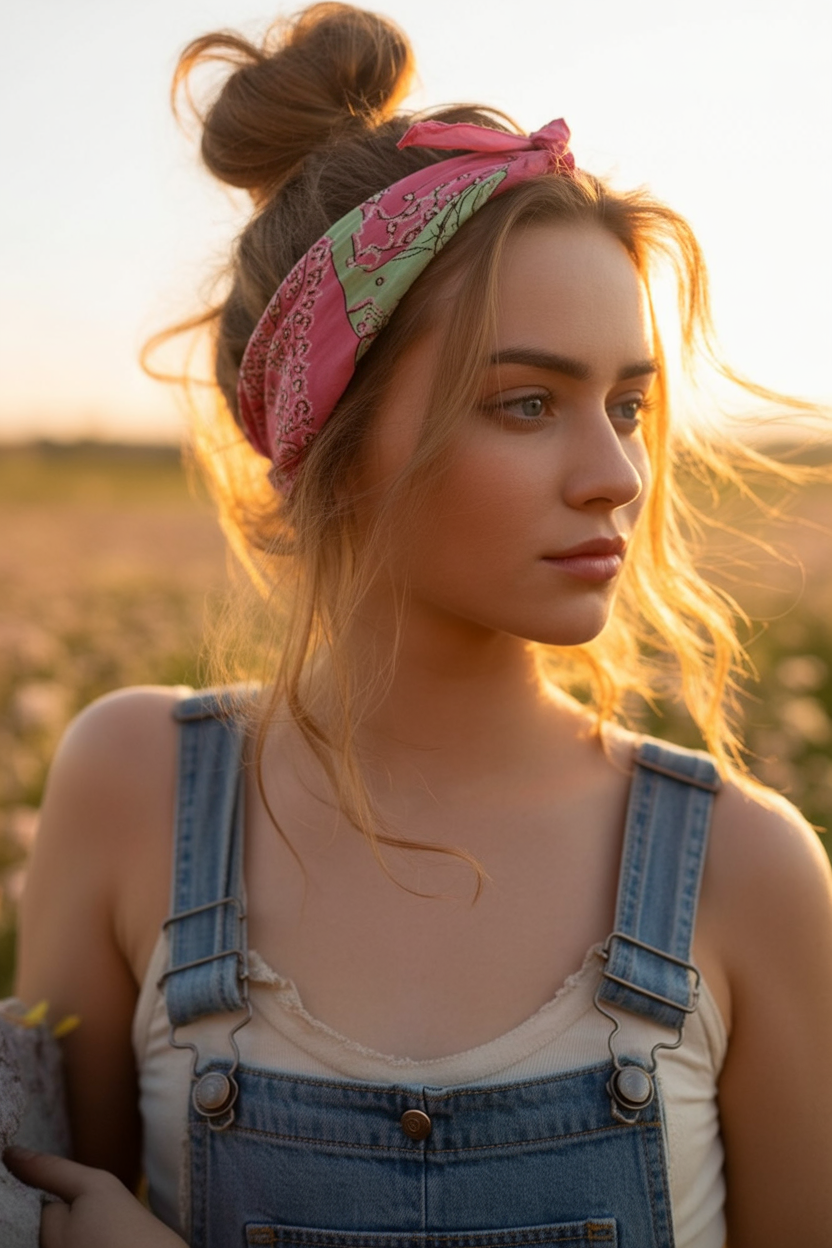 High, loose bun with a colorful bandana to hold it in place under the gorgeous sunshine is equal to fast freedom of summertime. It is easy, young, and very apt on outing days when you do not want your hair in your face but want to look picture ready. The windswept hair that curls against the face makes it appear natural and naturalistic in a sense of being out of a perfect moment.