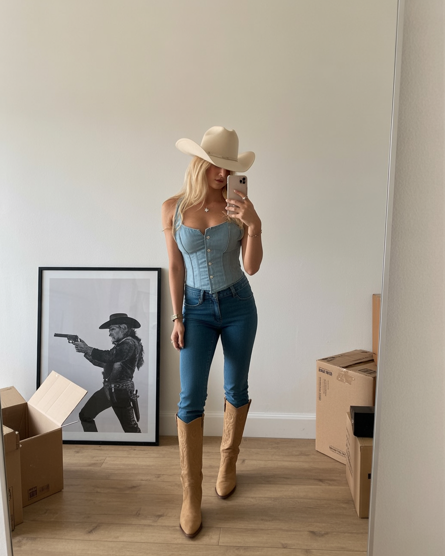 This look feels bold, modern, and quietly powerful. The fitted denim silhouette brings a confident cowgirl attitude while staying sleek and wearable. It’s casual but undeniably striking, the kind of outfit that makes you feel put together in seconds. There’s a clean, simple strength here that feels very now, perfect for women who like their western style polished rather than loud.