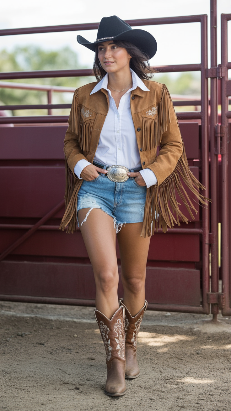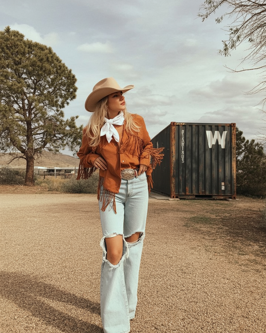 This look is full of movement and attitude. The fringe jacket adds instant drama, giving off a strong cowgirl vibe that feels confident and expressive. It’s bold but wearable, playful without being over-the-top—the kind of outfit that makes you stand a little taller.