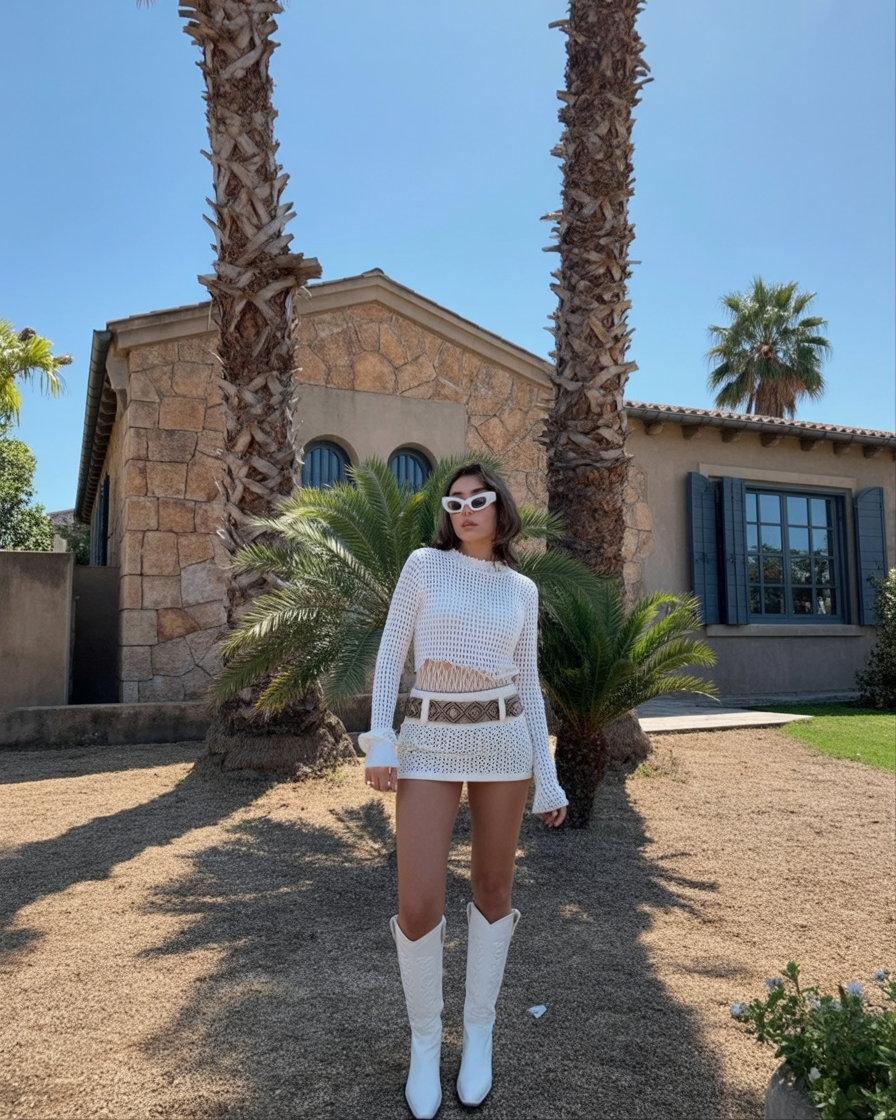 This look feels light, sunny, and effortlessly chic. The white knit set brings a soft women’s summer glow, while western accessories add structure and personality. It’s boho-leaning, fresh, and full of relaxed charm that feels perfect for warm climates.