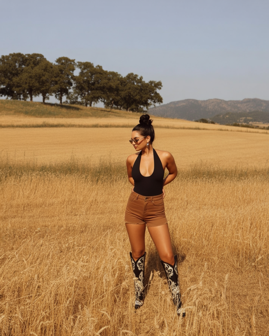This outfit feels warm, playful, and free—like a perfect summer afternoon. The silhouette is relaxed but confident, capturing that easy cowgirl spirit that feels timeless. It’s casual, flirty, and full of women’s summer energy, making it impossible not to smile when you wear it.